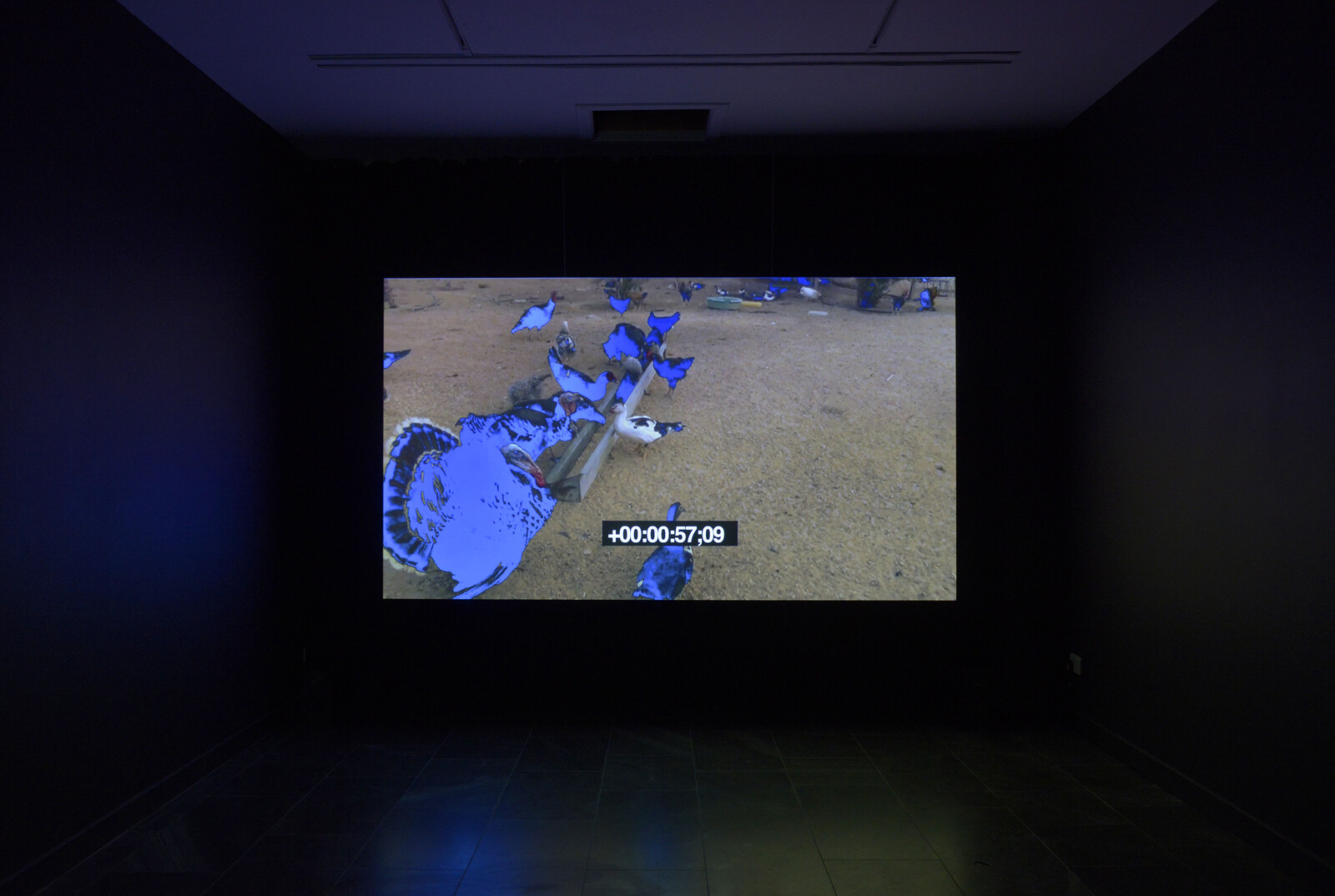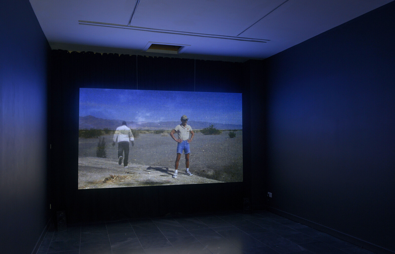 In “A Philistine,” presented across three distinct gallery spaces at Glasgow’s Centre for Contemporary Arts, Alsharif plays with time in differing ways. A screening room with a two-seater sofa shows three looped short videos that bring the domestic and geopolitical together. In Further Than The Eye Can See (2012), the story begins with Alsharif’s grandmother’s arrival in Cairo after being exiled from Jerusalem in 1948 and ends with her birth in Jerusalem 11 years earlier. Told in English by a male narrator as viewers hear but don’t see the protagonist, the soundtrack is accompanied by contemporary imagery of Dubai and Sharjah, bringing to the fore notions of the interchangeability of place, and of history being present rather than past. Home Movies Gaza (2013) focuses on the everyday in Gaza, beginning with footage shot from a car window and shown in reverse. Houses and graffiti-covered walls flit by, children play, a horse and cart looms in and out of view; ordinary life carries on but the political situation is inescapable. Renée’s Room (2015), takes viewers through a series of virtual (taken from the video game Grand Theft Auto) and real landscapes, including Death Valley in California, the historic city of Matera, Italy (used by Pier Paolo Pasolini as a stand-in for Palestine in his 1964 film The Gospel According to St. Matthew), a fifteenth-century chateau in Brittany, and bombed-out buildings in Gaza. What endures and what is lost is expressed through contrasting scenes of permanence and destruction.