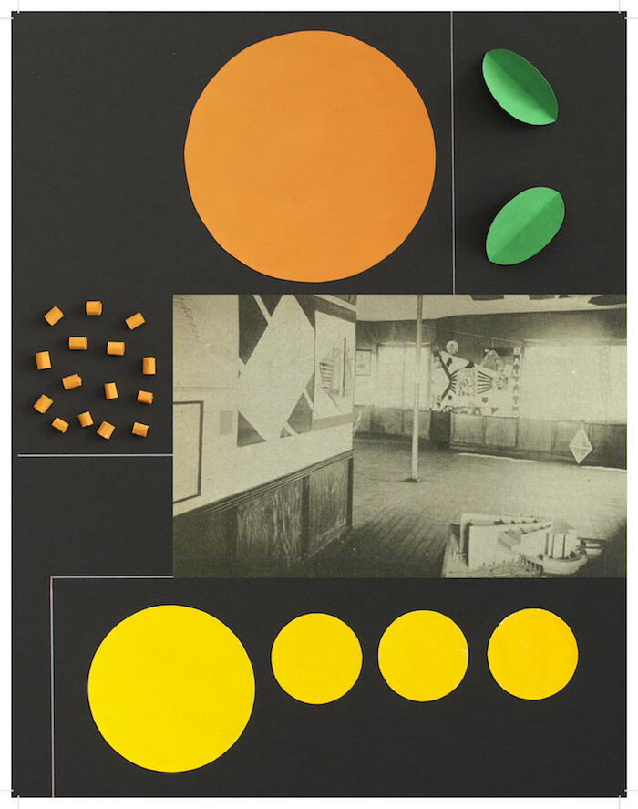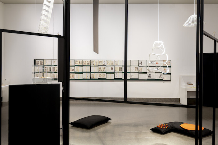 Luca Frei’s Model for a Pedagogical Vehicle, presented in another room, inserts itself with well-balanced elegance, accuracy, and inventiveness within the complex (and often troubled) canon of the remake of historical exhibitions. Model for a Pedagogical Vehicle restages “Exhibition of Life Construction,” a show conceived by Kawakita and Mizutani and held in Tokyo in 1931, which played a fundamental role in first introducing the Bauhaus to Japanese audiences. The exhibition was also the starting point for Kawakita’s Research Institute of Life Construction (1931–36), whose educational principles combined a careful attention to Japanese and western modernism with an industrial production agenda and an affiliation to the Bauhaus pedagogical methodology, namely the adoption of its preliminary course. Frei’s Pedagogical Vehicle appropriates the space around it, becoming an environment in which a portable structure referencing a prop of the post–World War II Japanese transdisciplinary collective Jikken Kōbō [Experimental Workshop] holds four black-and-white photos of “Exhibition of Life Construction.” Four reconstructions of paper studies featured in the images, made in collaboration with artist Eric Gjerde, are also hanging from it, accompanied by a set of large cushions that, by transposing the design of a ceiling diagram presented in the original 1931 exhibition to the floor, create a perceptive hiatus that proposes a humorous moment in the otherwise composed and dry environment of the exhibition as a whole.