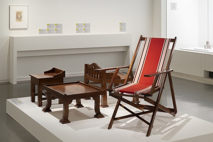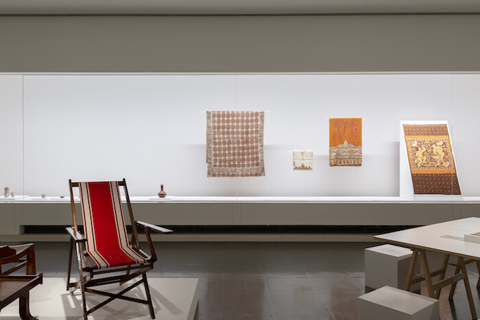 This curatorial criterion justifies the profusion of fragile, medium-sized materials that constitute “Corresponding With”—many of which aren’t artworks but testimonies of articulated systems of circulation of ideas and aesthetics. Spatially, the exhibition gravitates around three centripetal axes: Takehiko Mizutani’s sculpture Brass sheets cut into circular shapes and intersected, made in 1927 when he attendanded the preliminary course taught by Josef Albers; Luca Frei’s commissioned installation Model for a Pedagogical Vehicle (2018); and a set of four pieces of teak furniture from the 1930s—a stool, low chair, recliner, and low table—designed by Ratindranath Tagore, Rabindranath’s eldest son, after his trip to Japan.