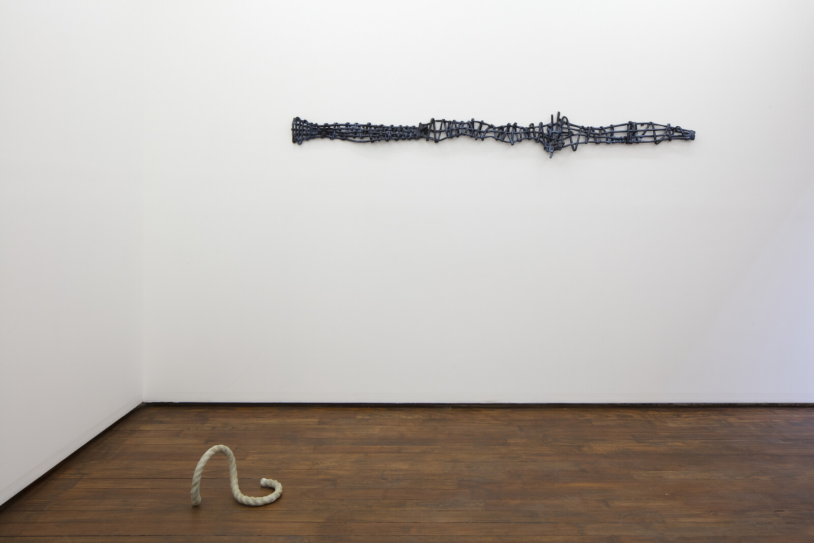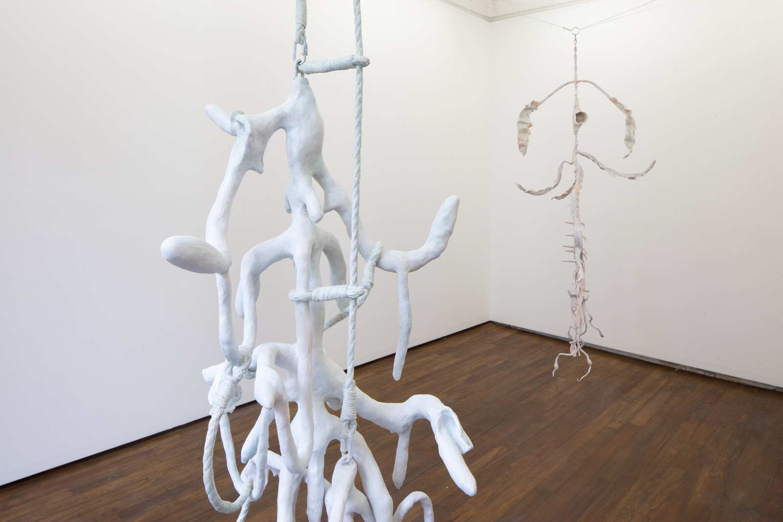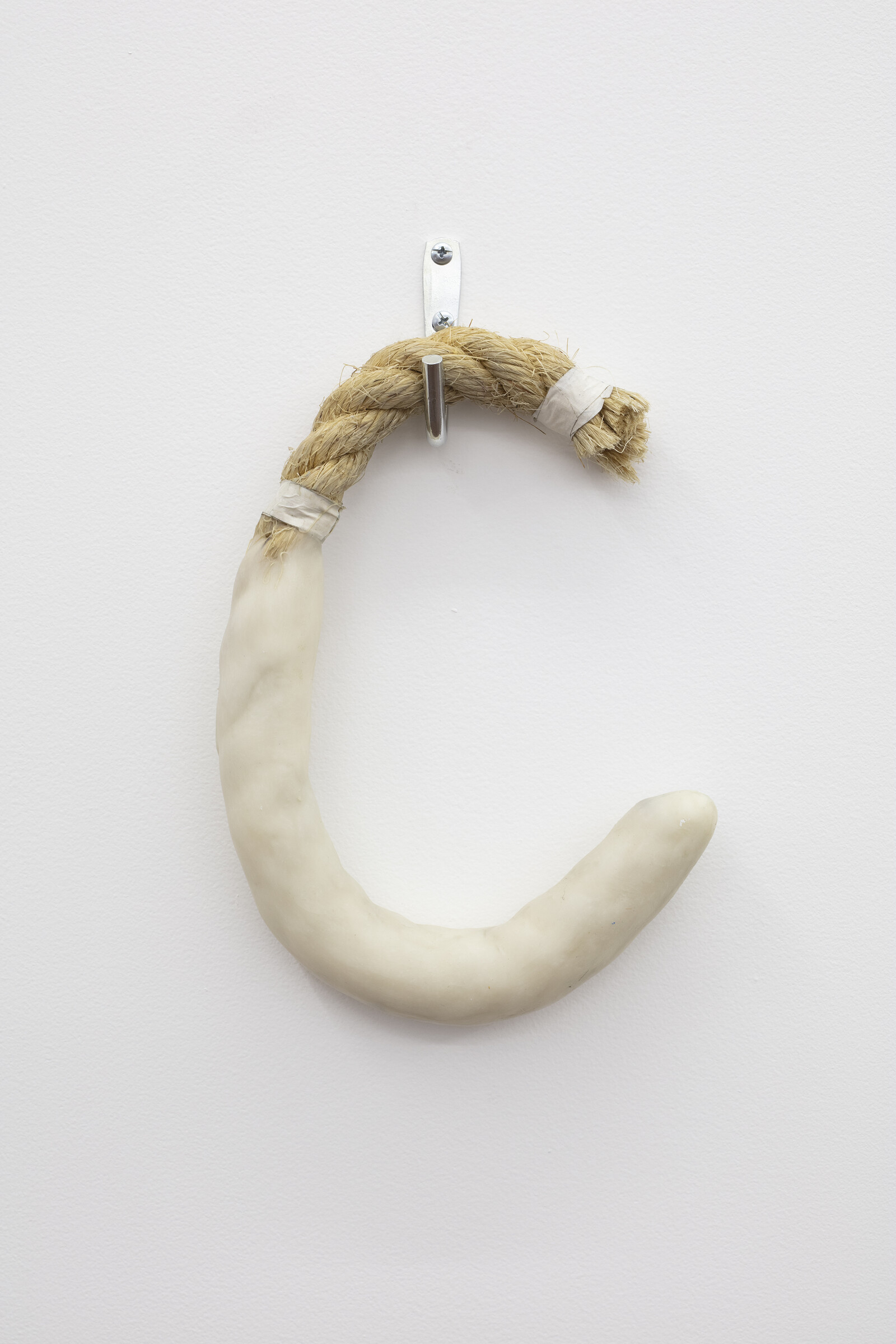 If Cerberus appears tentatively to explore its own organs and surrounding space, Black Nest, positioned across the room, is tangled up in itself. This deep mulberry-colored, cranium-like object is suspended from the ceiling by knotted bungee cords and fine twists of henequen cord. It is bodily and sexual, yet rigid and controlled: a tension reminiscent of BDSM. Their dynamic is completed by a smaller, similarly suggestive piece. SD is a worm-shaped segment of thick rope, thinly dipped in off-white cold porcelain so that its natural fibers are still visible. It ends in a rounded tip that perks up as it hangs from the wall.