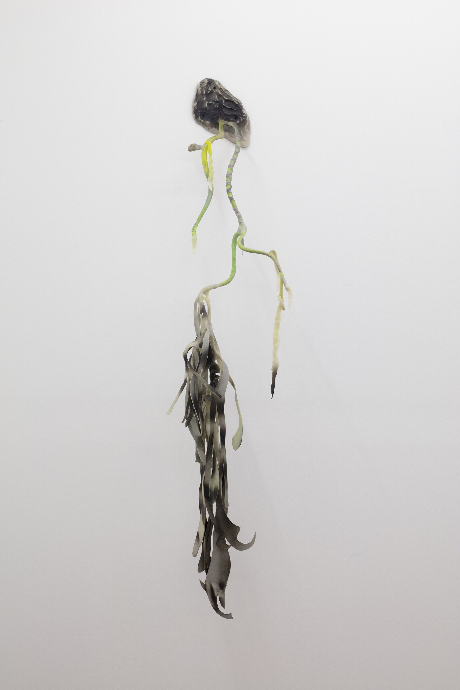 The works that open the exhibition are harder and fleshier; as one moves through the rooms, the works are more subtle and ethereal. On the second floor, two pieces—We lay proudly by the Iris field and Bone, Hyacinth and Ivy—hang ghostly from the ceiling in a shared pulley system. Their appearance is multivalent: they could be disembodied spirits, exotic botanical specimens, alien bones, metaphysical medusae. They comprise separate metal pieces covered in cold porcelain, combined with ceramics and joined together by chains, hardware, and rope. They are both white, their tentacles/leaves speckled with hints of light teal and pink. Their delicacy suggests they have consciously evolved together to better coexist in this particular space and form. Another highlight is Canopy (Sket) (2022), perhaps the most plant-like work in the show, but still surprising in its keen use of color and materials. It dangles from a rock-like base attached to the wall, two boney roots ending in flaccid yellowish nothings counterbalance the third branch, hairy with blackened, fern-like leaves.