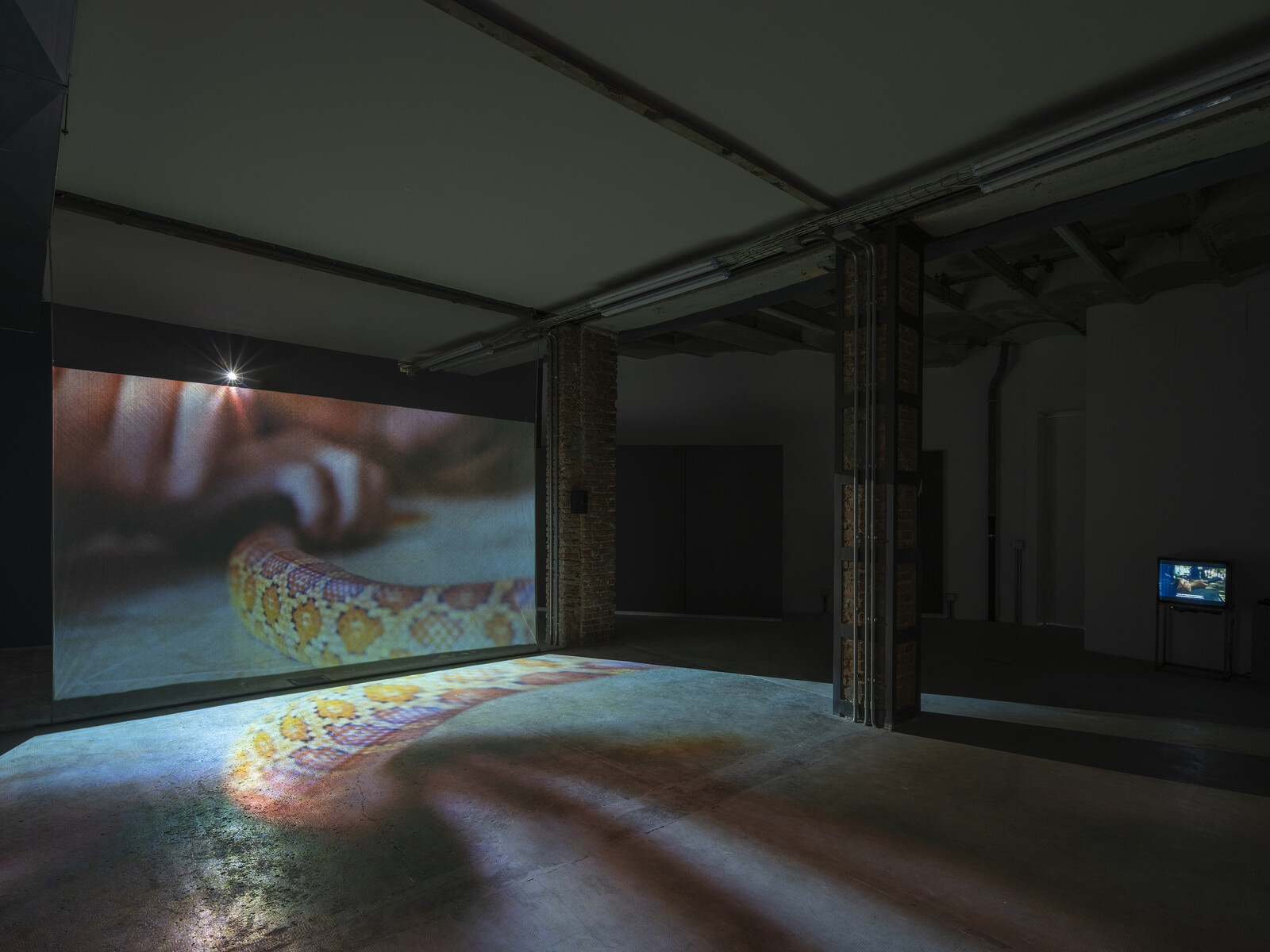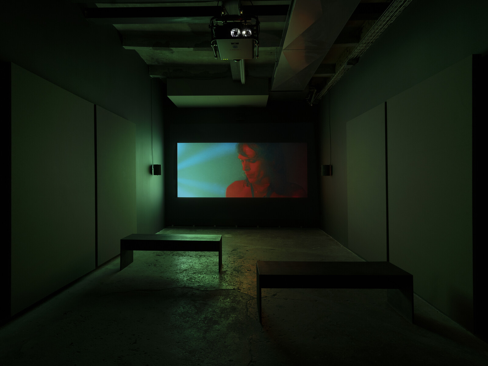 Dreaming Alcestis is slower, more abstract, and more meditative, again playing with movement from one country to another in an obliquely autobiographical way. It opens with a long shot of headlights fading into shots of Gibson, her partner Nick, and their children in a house full of unpacked boxes after their move to Palermo, the children playing (with each other and with a pet snake) as their parents sleep. The arrangement in the gallery is notable: Dreaming Alcestis dominates Ordet’s main space, and while the older films play on conventional screens, this film is back-projected through a transparent “Hologauze” screen, the image refracted on the floor as if it were a pool of water. The effect is impressive, duplicating and so defamiliarizing the otherwise commonplace images of sleep, giving them an enigmatic, permeable quality that might occur in a dream.