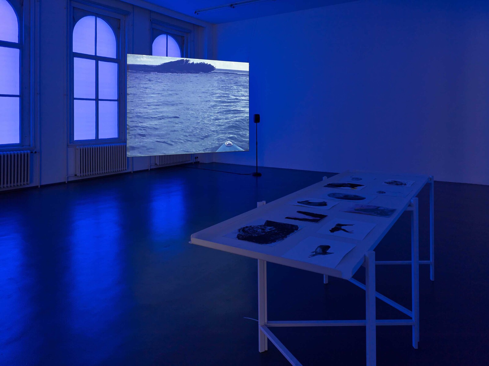 A newer work, El cuervo, la fosa y la yegua [The raven, the trench, and the mare] (2021), is projected alone in an adjacent gallery. It pulls together underwater footage from the Puerto Rico Trench, the deepest point in the Atlantic Ocean, with ethnographic sequences of a woman working by firelight, marking an interior dirt floor with flour to form a vèvè, a beacon drawn to orient the spirits during a Vodun ritual. These fragments taken from disparate filmic languages intersect with only the voiceover track of Italian physicist Carlo Rovelli’s reflections on time to maintain narrative continuity. Footage shot over the woman’s shoulder as she holds a candle in one hand and unfurls the flour in a line on the dirt floor with the other is abruptly cut to a shot of an abstract indigo stain spreading through a milky volume, presumably in the deep ocean. In each, the penetration of some dimension by another is suggested. When the shot changes back to show the woman at work, it takes a moment to register that the film is reversed; now her gestures gather the flour back up off the floor and into a shallow bowl, erasing the image as she works. In either temporal direction, she could be wiping a countertop or rolling out dough; her movements are that practiced and straightforward.