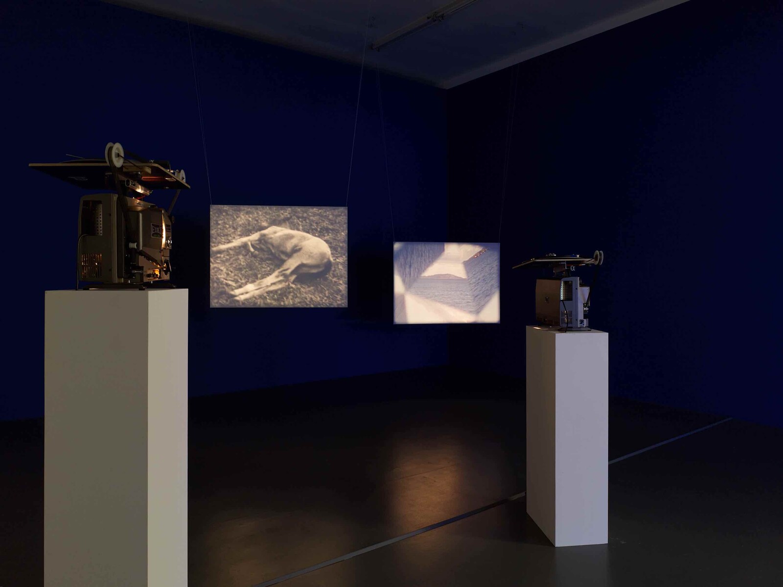 Both Otros usos and another silent 16mm film projected beside it, Black Beach/Horse/Camp/The Dead/Forces (2016) do have a precise physical referent: the island of Vieques in the Caribbean near Puerto Rico that the US Navy used as a bombing range and a training ground for over sixty years. In Otros usos, Muñoz’s carefully folded image is shot from the end of a massive dock built in the 1940s to service US battleships that extends a mile and a half into the water. Both films also have a specific aesthetico-political ambition: to depict Vieques in a manner that “will not reproduce the ideology of military ruin,” according to the artist’s statement on the wall label. The other half of the installation, Black Beach/Horse/Camp/The Dead/Forces, takes that ambition off the dock and into the island’s landscapes. It is made of visual anecdotes, such as one in which Muñoz films a man in the shallows. The shot cuts so close to his body that the space of Vieques is rendered as purposeful, circular movement through water near sand.