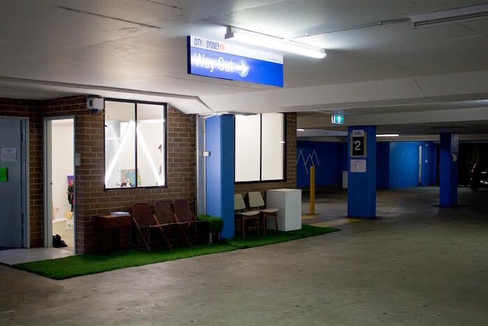 In an urban context, garages and parking lots are often situated below ground and are preyed upon by galleries, artist-run initiatives, and temporary venues for the functional reasons mentioned above. Nevertheless, some initiatives seem to have sprouted and taken root in the specificity of an ecosystem, corresponding with the particular narratives of a neighborhood or a city. Until recently, Chert Gallery in Berlin was located in a former car repair shop that had holes in the ground. In 2012 David Horvitz founded a gallery in one such hole underneath the floorboards. Called Porcino, it hosted projects corresponding with the gallery’s program, like a mushroom in symbiosis with its host tree.1 In Paris, the artist-run initiative -1 (moins un) is located in the car park below a residential building, not far from several sites targeted during last November’s Paris attacks. In what seems now a strange foreboding, in 2014 the Brussels-based collective The Ister invited—for the second iteration of their “Fortune” project—the Berlin collective Dingum to fill the basement with restaurant tables covered with white cloths, where guests sat and drank wine, inverting the paradigmatic Parisian public space of the terrace in a space that remains invisible from the outside. Sydney’s Alaska Projects started their activity in 2011 at Level -2 of a car park, managing to organize exhibitions and events from a five-by-five-meter white box over two parking spots. Alaska Projects later found other spaces for studios and parallel projects, becoming an important supporter of emerging artists in the city, where it also stood out as one of the only free spaces in which artists could make exhibitions—it is standard in Australia for artists to pay to show in noncommercial or non-institutional spaces.