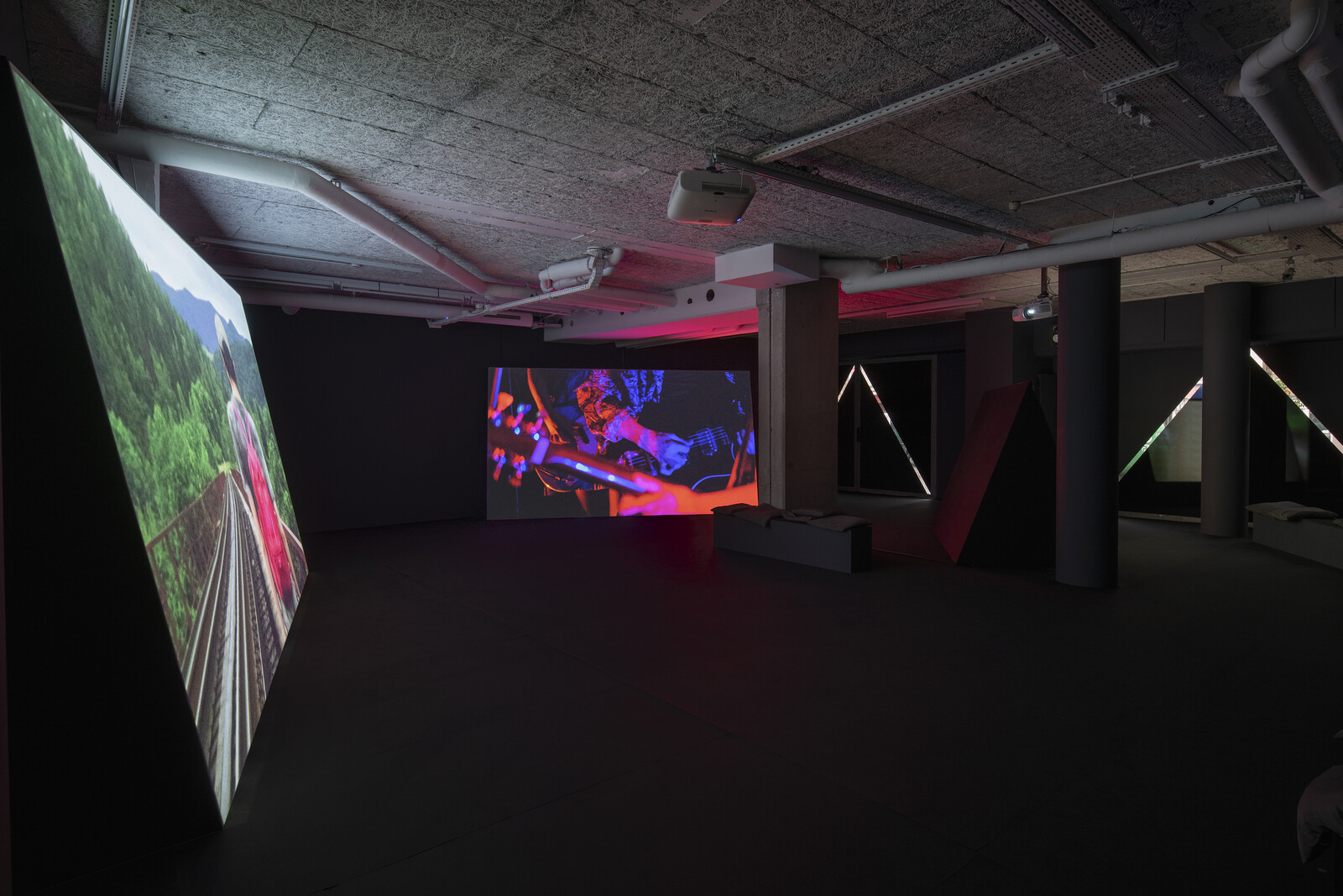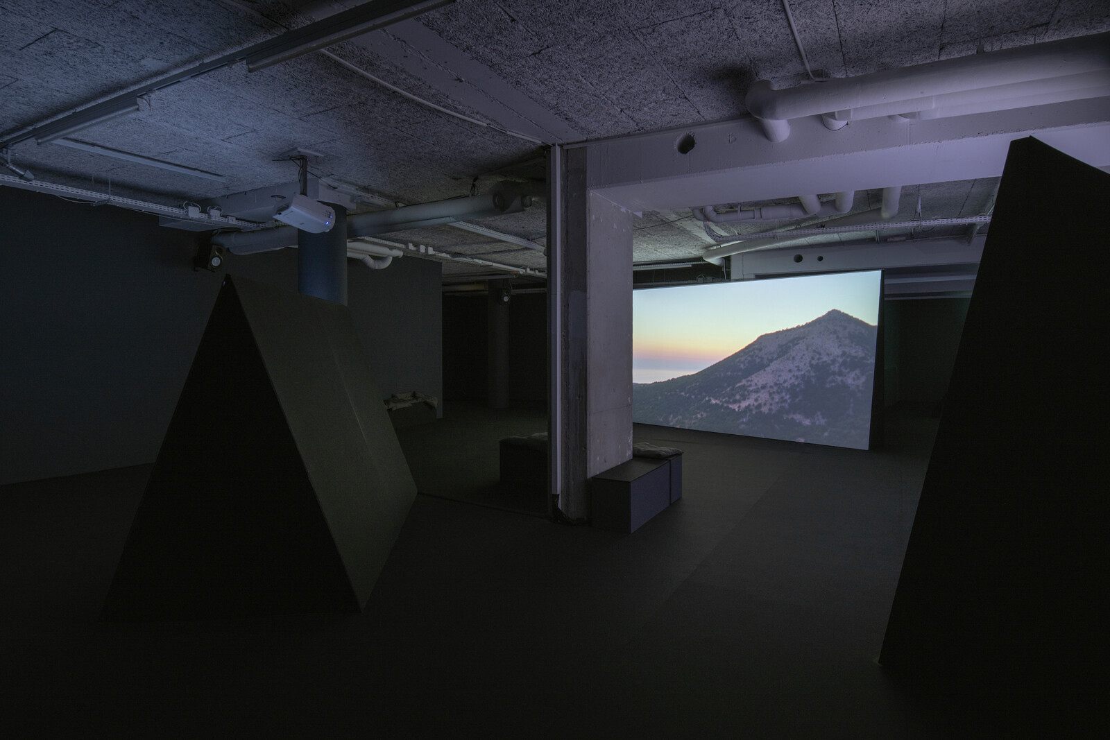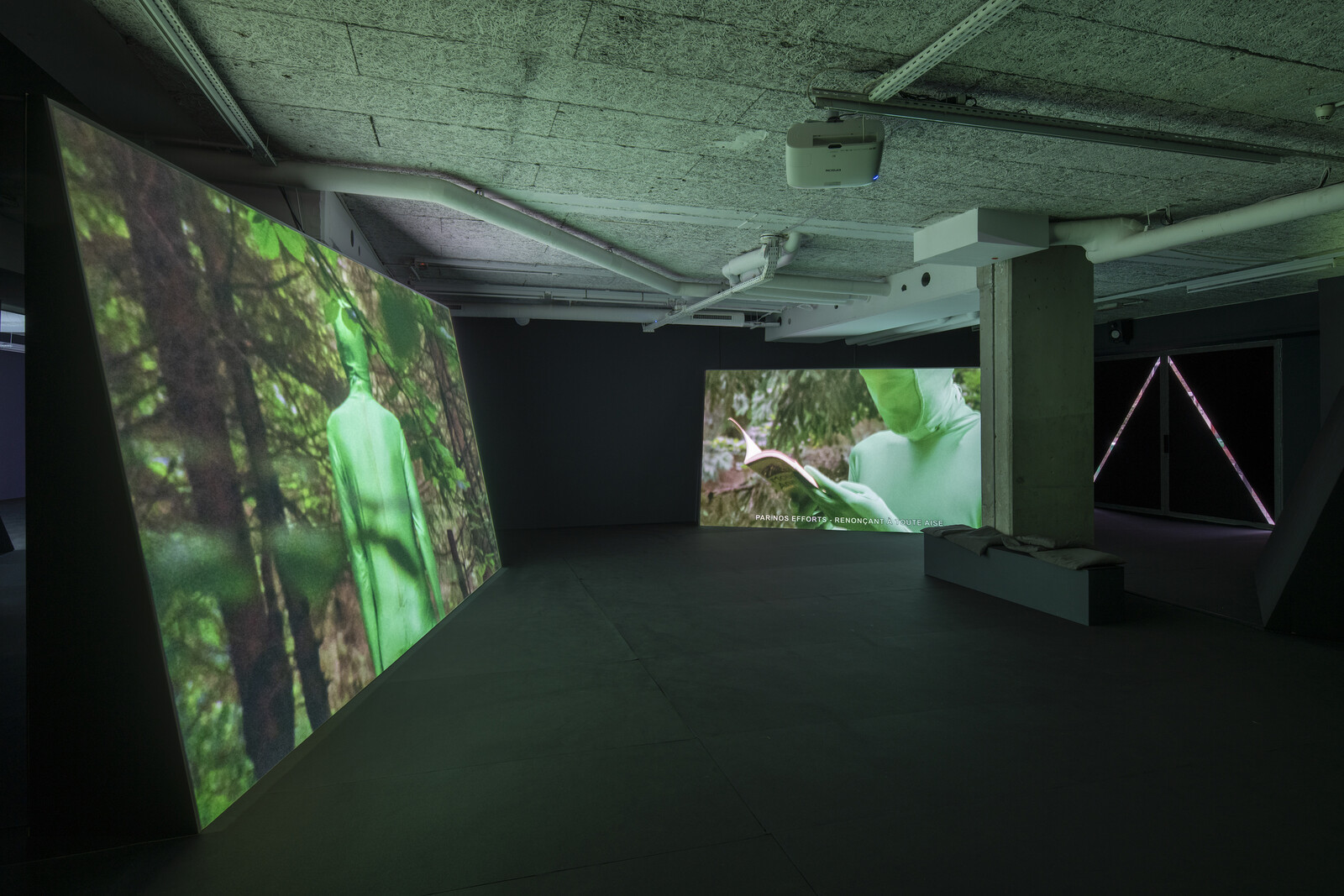 Russell excels in rethinking Daumal’s saga. He acknowledges that it is impossible to share the outcome of an expedition, yet manages to induce in the viewer the outlandish experience of a journey. At the same time, he renders the story universal by transposing it to a concrete context. The work that names the show, La montagne invisible (2020), comprises an installation of five looped videos (super 16mm transferred to HD) exhibited across various areas of darkened exhibition space, some projected onto large triangular volumes that surround visitors like a chain of mountains, others presented on flat screens, which often intersect one another’s images and sounds. Each video offers snippets from a journey in which the artist accompanied and filmed his friend Tuomo Tuovinen’s walk from Finland to Greece. The two of them were joined by various other companions, who participated in this experiment in movement and seclusion. Beautiful footage of Tuovinen placidly swimming in a central European lake is paired with shots of a slender green human figure wandering across lush fern vegetation, waiting to be chroma-keyed to invisibility, or with images of Tuovinen on a beach holding a flat surface with a triangle cut in the middle towards the camera: the superimposing of the geometric form both frames the landscape and turns it into an abstract, unreachable mountain. Brought together, these unrelated scenes challenge the traditional progression of a travelogue narrative. Here, the journey is relived, retold, and remembered through disconnected spatial and chronological leaps, whose fragmented nature is skillfully re-enacted by the exhibition’s layered and non-linear arrangement.