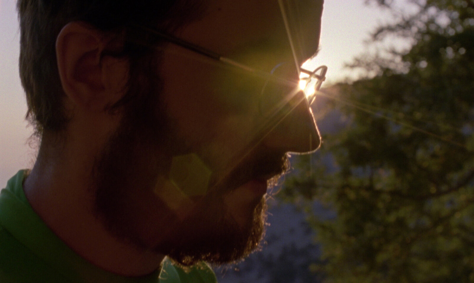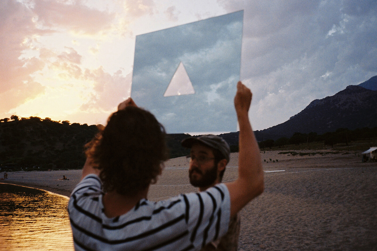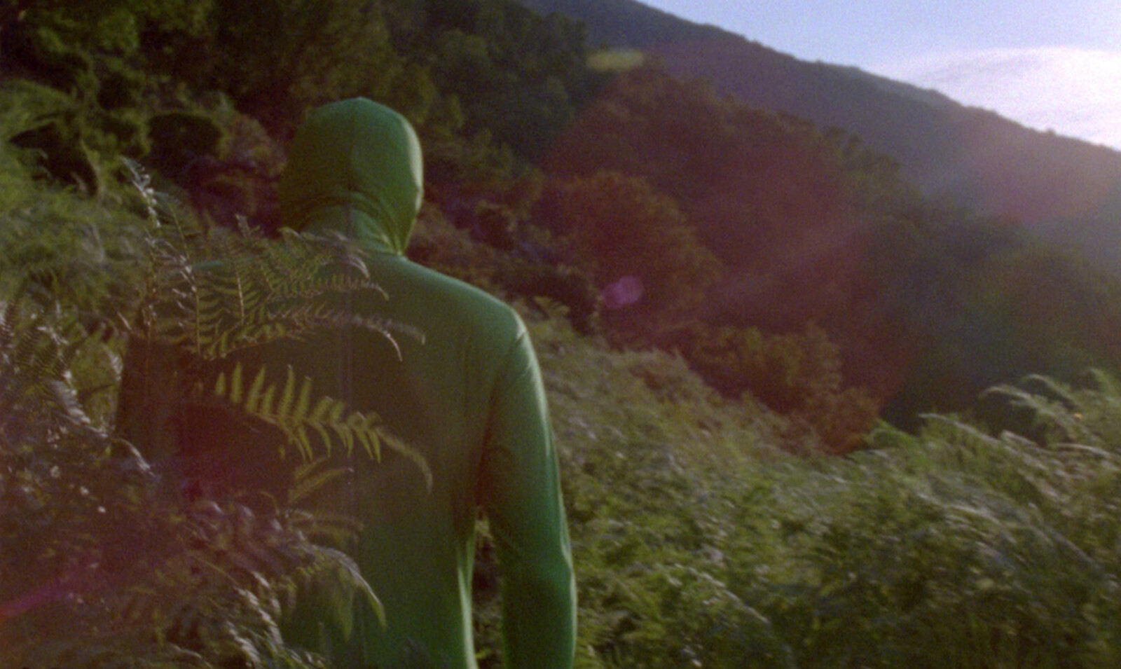 Russell excels in rethinking Daumal’s saga. He acknowledges that it is impossible to share the outcome of an expedition, yet manages to induce in the viewer the outlandish experience of a journey. At the same time, he renders the story universal by transposing it to a concrete context. The work that names the show, La montagne invisible (2020), comprises an installation of five looped videos (super 16mm transferred to HD) exhibited across various areas of darkened exhibition space, some projected onto large triangular volumes that surround visitors like a chain of mountains, others presented on flat screens, which often intersect one another’s images and sounds. Each video offers snippets from a journey in which the artist accompanied and filmed his friend Tuomo Tuovinen’s walk from Finland to Greece. The two of them were joined by various other companions, who participated in this experiment in movement and seclusion. Beautiful footage of Tuovinen placidly swimming in a central European lake is paired with shots of a slender green human figure wandering across lush fern vegetation, waiting to be chroma-keyed to invisibility, or with images of Tuovinen on a beach holding a flat surface with a triangle cut in the middle towards the camera: the superimposing of the geometric form both frames the landscape and turns it into an abstract, unreachable mountain. Brought together, these unrelated scenes challenge the traditional progression of a travelogue narrative. Here, the journey is relived, retold, and remembered through disconnected spatial and chronological leaps, whose fragmented nature is skillfully re-enacted by the exhibition’s layered and non-linear arrangement.