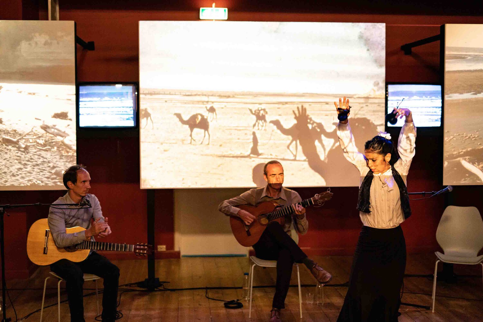 Lange’s “audiovisual environmental opera” had been performed with different collaborators and in various versions over the 1980s and ’90s. In this version, flamenco dance and guitar play over, and in relation to, a series of screens depicting moving and still images. The footage features documentary material about pollution and the destruction of the livelihood of Maori people, archival footage of mushroom clouds, and scenes from a flamenco demonstration. The visual juxtaposition of these images was intended to connect the struggles of the Roma—who are credited with contributing significantly to the development and continuity of flamenco—with the indigenous people of New Zealand. With its live accompaniment of singing, guitar, and dancing, the event struck me as a lively counterposition to the exhibition just outside of it. The wildly unexpected combination of nuclear war, expanded cinema, and flamenco had a hypnotic and cathartic effect. It came across as out of place in a museum, which felt right. Here, a single work encompasses all of these ostensibly disparate elements and in doing so exudes a feeling of artistic freedom and political possibility, and shines a light on some of the strategy and sensibility missing from the exhibition surrounding it. The performance’s 1980s rage and hopefulness was an injection of the kind of energy that is endemic to effective movement.