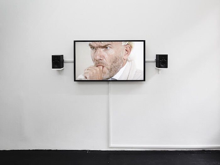 Northern burnout comes to mind in de Gruyter and Thys’s work. White steel structures double as cutout figures, with deadpan portraits of white Europeans delicately hung on the hard metal. In their video Die Aap van Bloemfontein [The Ape from Bloemfontein] (2014), amateur models with bad haircuts stand in silence, dressed so normal that it freaks me out. A voiceover narrates this film of worried-looking actors, who seem to be lying in state even when upright. The camera zooms in on their sweaty skin, which has the unattractive consistency of boiled milk fat. The narrator talks about appendicitis and getting glasses of water and oranges and bananas speaking to each other. Once again meaning is flattened, and you can’t distinguish between hydration and insanity. Like indigestion, or Belgian humor, it all makes me feel uncomfortable.