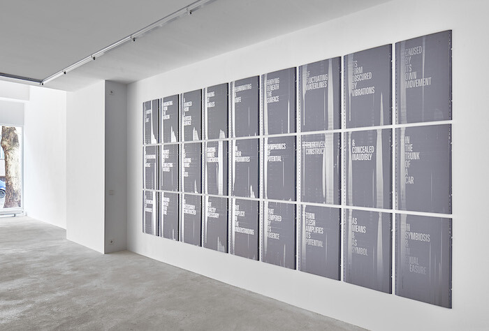 Also eerie, though more beautiful and not funny at all, was the opening of Studio for Propositional Cinema’s “(To the Spectator:)” at Tanya Leighton the following night. SPC is a conceptual group effort and therefore consists of an intentionally confusing set of strategies. I arrived late, and it appeared that the exhibition was closed, but everyone was still hanging out. It turns out there are no lights in the show. Natural light and darkness as a gimmick gives visitors the added, and rare, possibility to feel connected: to nature, to cycles bigger than ourselves and our fears and our agendas. In the dark, I could make out stenciled texts above doorways in the gallery. Struggling, I read one: “BEING OBSERVED / SHE TURNS HERSELF INTO AN IMAGE / FOR HIM BUT FROM WHICH HE IS CROPPED.” Like this poetry, supposedly written by SPD, there’s something ambivalent about reading in the dark. It’s at once a private indulgence, like looking for food in the fridge in the middle of the night, and, when public, it’s also a small outcry, demonstrating a kind of angst to know, like a Bildungsroman. I went back the following Saturday to see the works in unusually hot sunlight. In addition to the stencils, there’s fragile and sentimental poetic text printed on different metals and foils. The combination of self-evasiveness and somatic violence is very complicated and difficult to understand: “THEY ARE ABSORBED ONLY LONG ENOUGH TO SUGGEST WHAT COULD HAVE BEEN & REMEMBERED ONLY INSOFAR AS THEY SUGGEST WHAT STILL COULD COME: A LENS AS A CONDUIT CONSTRUCTED TO BE FOGGED A SKIN AS A PRECIPICE DESIGNED TO BE FLAYED).”