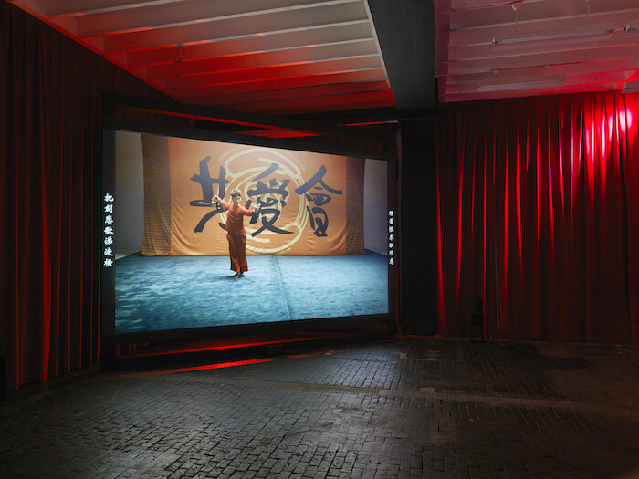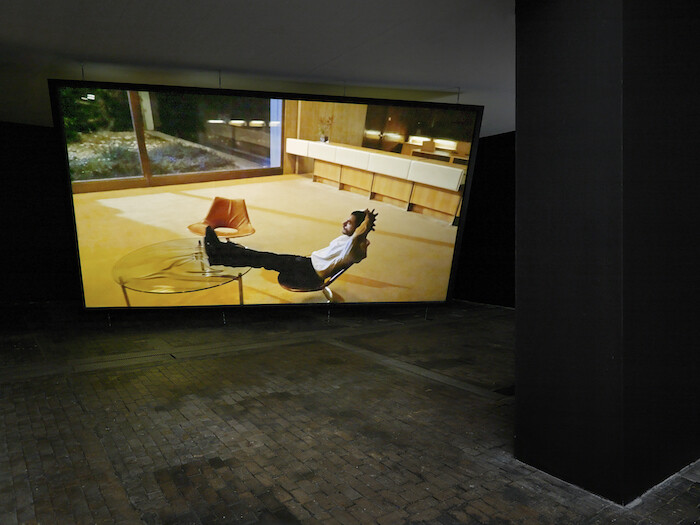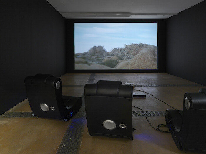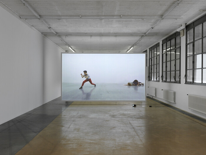 In the absence of an overall theme, it’s our murky zeitgeist that dictates the cohesiveness of this edition of BIM, which introduces 27 new productions, debuting here mostly in two forms: as video installations, each granted an individual room at the Centre d’Art Contemporain Genève and the adjoining MAMCO museum; and as widescreen films projected at Cinéma Spoutnik and Cinéma Dynamo. The opening week also included a series of joint performances by John Armleder and Stephan Eicher, Boudry and Lorenz, and Boychild and Wu Tsang (whose video Duilian, 2016, which premiered at the Berlin Biennale, is on show). The layout, alternating large and small spaces divided by heavy curtains, is well paced and allows for moments of quiet contemplation, with the notable exception of Trisha Baga’s 3D installation MABUHAY (2016). In this tour de force of visual stimulation, where shots of the CERN collider collide with overlapping images, glitches, flying fruits, and fragments of the artist’s travels in the history of the Philippines as well as that of her own family, any attempt to adjust focal distance proves a fail and an eye strain. Our impotence in keeping up with the deluge of images becomes an embodied experience. Emily Wardill’s I gave my love to a cherry that had no stone (2016) also rejects the canonical frontality of projections, instead adopting a large, tilted screen, looming over the visitors. Set in the auditorium of the Calouste Gulbenkian Foundation in Lisbon at night, the film follows the disjointed movements of a dancer across the modernist spaces: there is something sinister in the man’s fast robotic jerks backwards and forwards, and the oddity of his physical demeanor is intensified by short glitches (an eye bulges out, as in cartoons; the background liquefies), so that one inevitably questions what one is looking at.