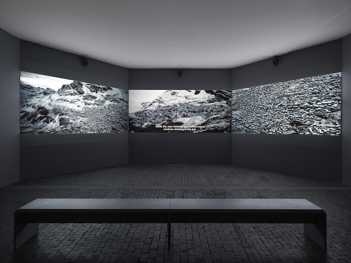 On the documentary side, a standout is the three-channel installation The Burial of the Dead (2016) by Portuguese filmmaker Salomé Lamas, shot in the gold-mining town of La Rinconada, on the high Andes of Peru, more than 5,000 meters above sea level. After an initial panning shot on the majestic landscape covered in snow, for the majority of the video’s 90 minutes the camera sticks to a disturbing fixity: it records an unrelenting river of obscure bodies, those of the miners climbing up the steep town’s streets at dusk, like insects crawling in the dark. The images form a triptych: a wide central scene, and two side ones that either replicate it or crop it in circular shapes. With little to be seen, the names, voices, and life stories, recounted in the first person, of those who come here to suffer “hunger and cold” occupy center stage. Men and women talk about their family stories and daily labors with a technical lingo that refers to the manual methods used for extracting the mineral as well as to the abusive “legal” rules established by contractors, leaving meager profit and no protection to the workers. “Rinconada is not for everybody,” says one of the miners: it’s a hellish “home of the brave,” bearing witness to how rooted in the ruthless foundation myth of the Gold Rush the American dream is.