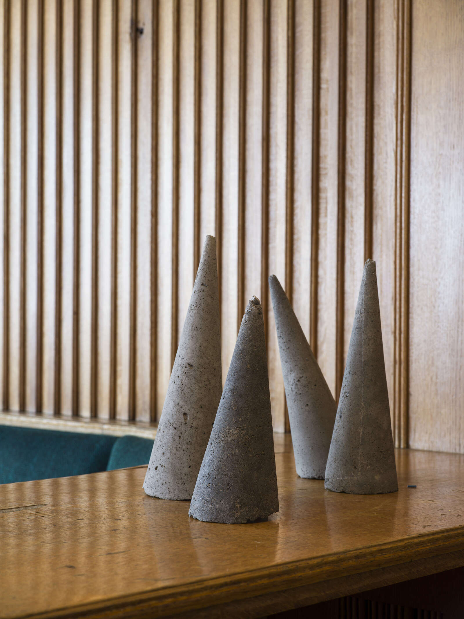 Ortisei is surrounded by forests, so it feels natural for wood to form both material and motif in several works commissioned for the biennial. Julius von Bismarck’s monumental Beetle On A Horse (2024) is placed in the town center; if you stand in the right position, you can glimpse the forest behind it where the stone pine wood out of which it’s carved, and the bark beetle it depicts, are derived. In an alternate reality that memorializes bugs in the place of humans and more charismatic larger animals, the bark beetle is depicted as a conqueror. In some ways it is: the work is also a comment on the devastation of entire woodland areas by the beetle, which (aided by humans planting trees too closely together, in a less positive form of interspecies collaboration) has infested the forest. In one of the more visually impactful works, Ingela Ihrman’s First Came the Ocean (2024) borrows from archaeology and uses wood to recreate the fossils of a ginormous creature, recalling the formation of the Dolomite mountain ranges through the accumulation of fossilized coral reefs over 250 million years. Other works concealed the material, like Nadia Kaabi Linke’s Mushroom (2024), where a tree peaks out in patchy gaps from beneath the concrete in which it is submerged, Laurent Le Deunff’s Chouette des neiges, Crocodile, Escargot (2024), where it could pass for stone, or Alessandro Biggio’s burnt-down trees molded with water to form Ash Cones (2010–ongoing).