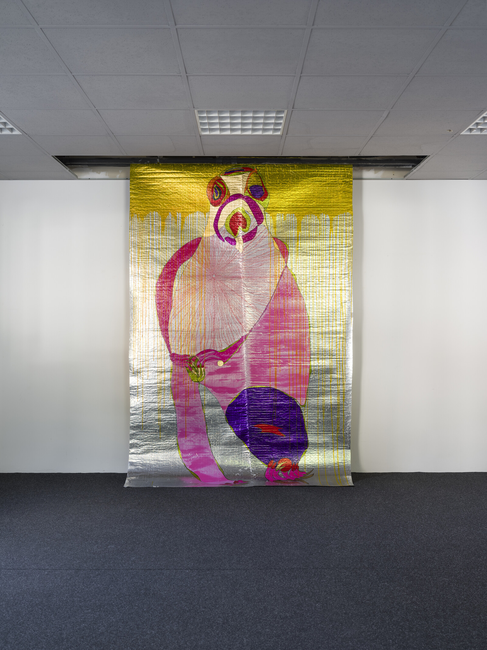 The Pontives industrial park hosts most of the moving image works, one standout being a video essay by Nadim Choufi on the future of human and other life forms in an economy that exploits the labor of both. Here you’ll also find the work of Atelier dell’Errore. This collective emerged to accommodate people who had aged out of a recreative program for neurodivergent young people in Reggio Emilia and Bergamo. All their works are made collectively, feature animals as their primary subjects, and build on any mistakes, instead of erasing them. In keeping with their principles, they’ve shown their experiments in the process of creating Marmottoloide (2024), a mixed-media drawing on an emergency blanket-like material, conjuring images of migrants who use the blankets to protect themselves from exposure when crossing the Mediterranean. The multicolored marmot on the heat sheet canvas wears an inscrutable expression but is proud in its stance, recalling the prophesies that the ground squirrel will stand alongside the Fanes when their kingdom rises again. It’s a projection into a future that is unpredictable but laden with hope, stressing interdependence as a means of survival. Blending myth and contemporary issues, it’s a mashup of timelines that resonates whenever I see the biennial posters featuring Atelier dell’Errore’s marmot around the town.