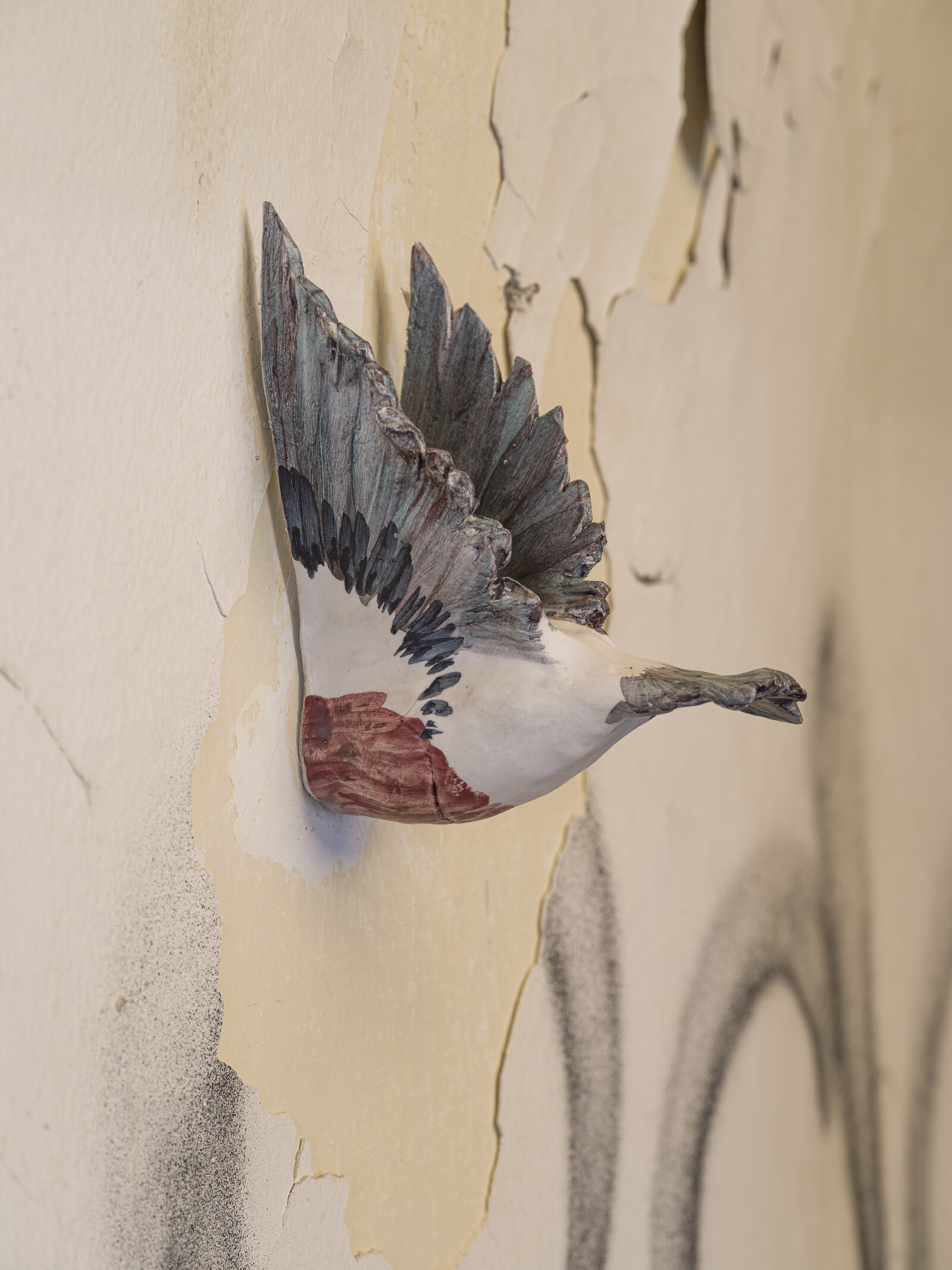 In the darkened theater of Cësa di Ladins Museum, a bird’s song plays over speakers. Starting off with sweet melodious notes, Ruth Beraha’s Il cielo è deI violenti (The sky belongs to the violent, 2024) soon multiplies and swells, converging in discordant screeches that remind us that nature can be comforting and accommodating but also menacing and overwhelming—like the marmot, a cute-looking ground squirrel which has, reasonably, been described as “vicious.”1 The song loops back to the beginning, maintaining the tension between calm and panic. Beraha picks up the ornithological note again in Fortune’s always hiding, I’ve looked everywhere (2024), where ceramic birds appear to fly into the walls of the Hotel Ladinia. At first the work appears fantastical, as though the birds are disappearing into a world beyond, but on repeated viewings it evokes—just as ominously—the millions of birds that crash into skyscrapers each year.