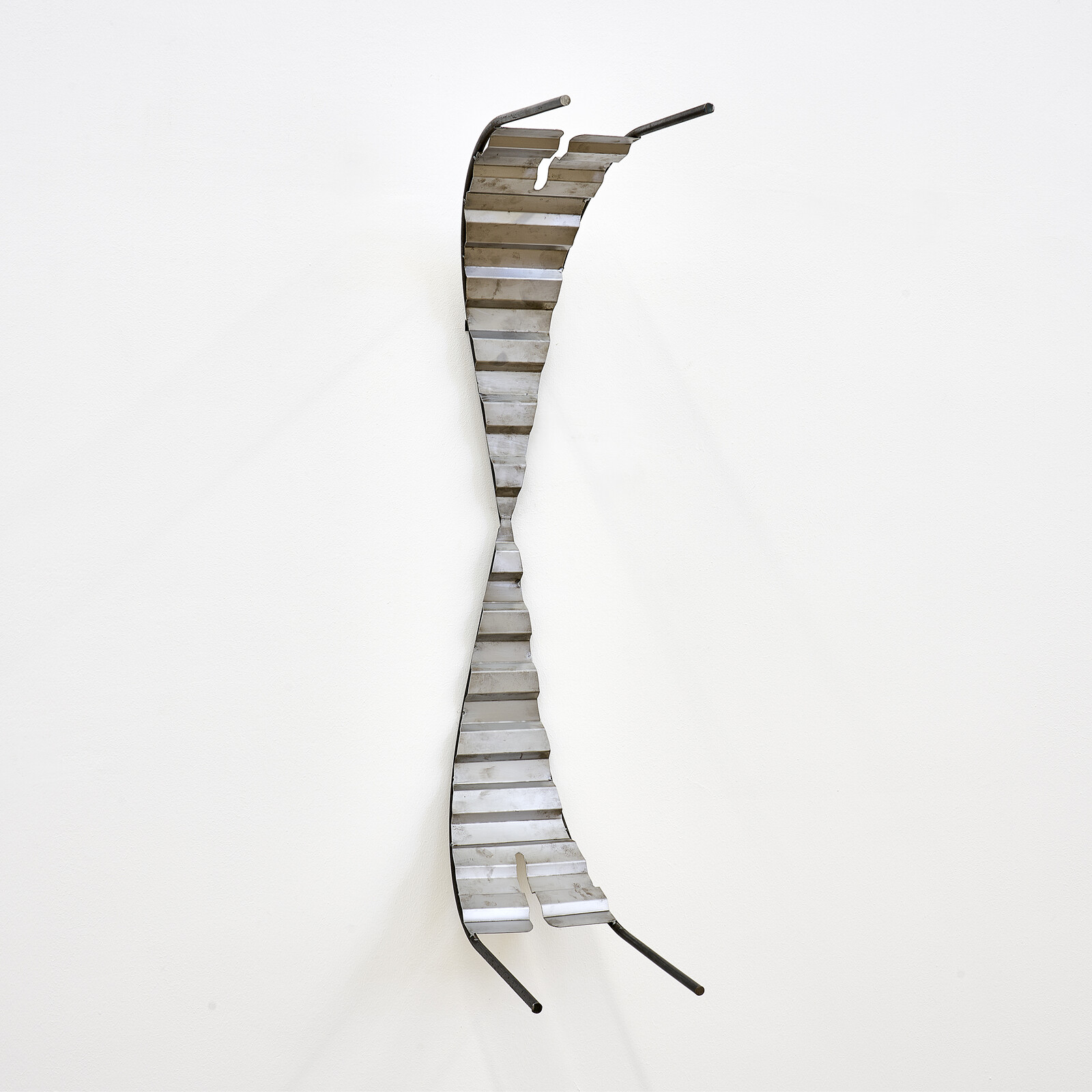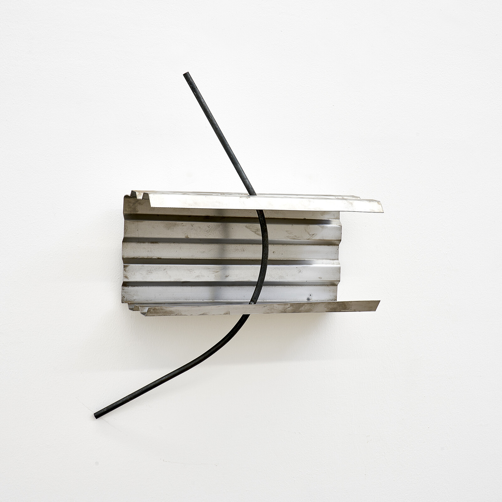 A smaller space at the rear of the gallery showcases four abstract sculptures made from corrugated iron and round steel. Each is named for a click consonant. // (2019) vaguely resembles a moth, its bent steel bars forming the antennae and the triangular-cut iron serving as improbable wings. More presciently, this quartet of rudimentary sculptures recalls Mozambique-born artist Ângela Ferreira’s sculpture series “Sites and Services” (1991–92), made of mild steel, PVC piping, cement, wood, and aluminum. Ferreira drew inspiration for this work from newly landscaped plots of land outside Cape Town equipped with basic service infrastructure. “Sites and Services” proposed a new and utterly enthralling abstract sculpture inspired by the post-apartheid landscape. Katz’s work presents a dynamic continuation of this liberated practice, one whose vitalities exceed a doctrinaire rehearsal of postminimalism.