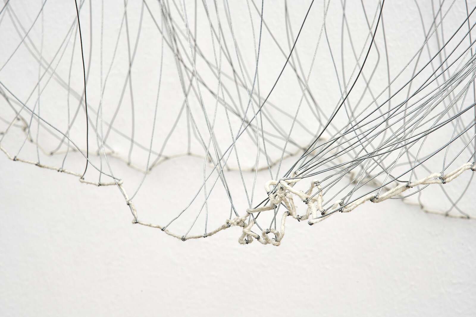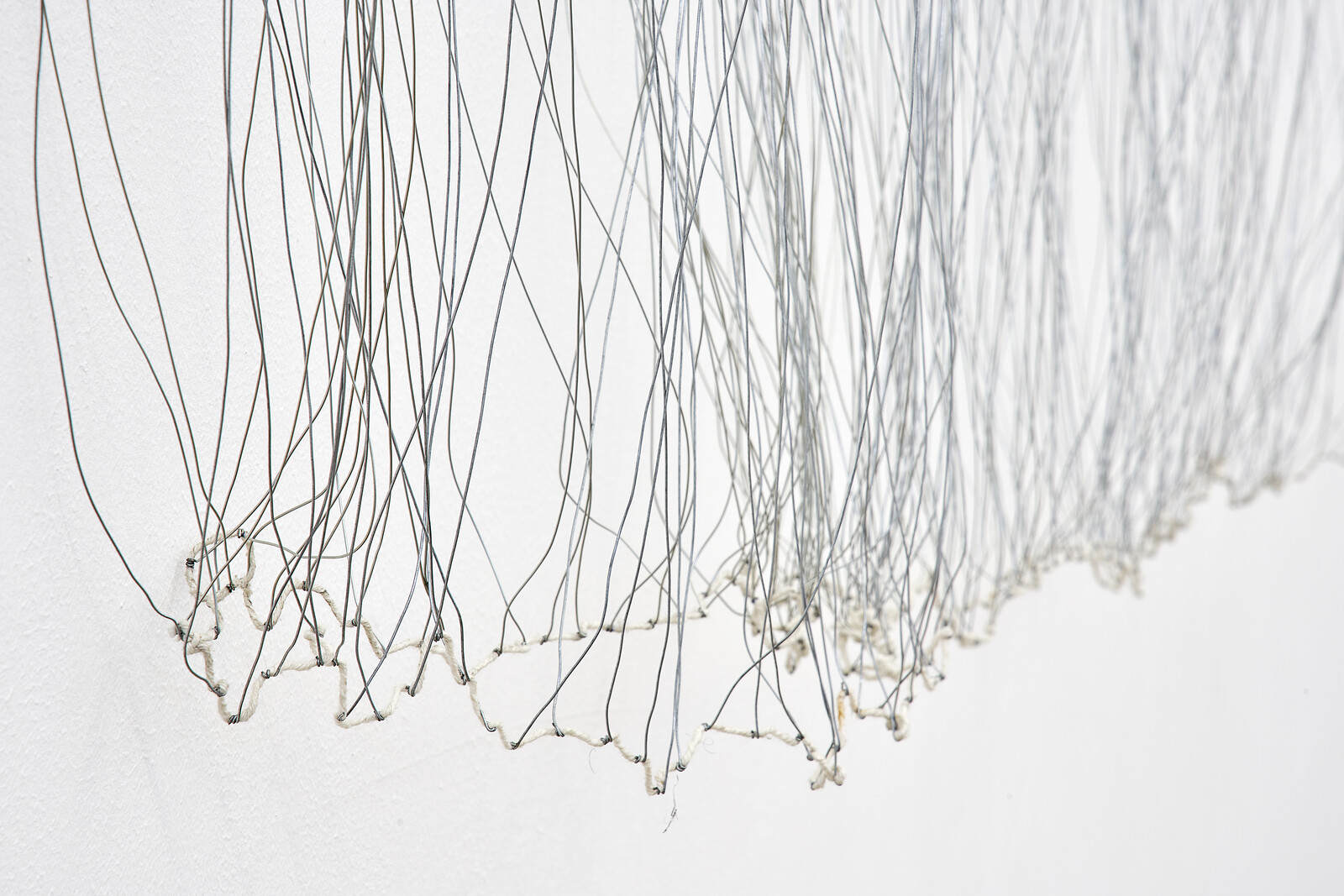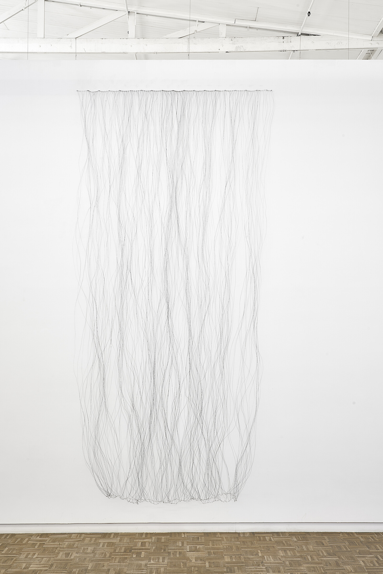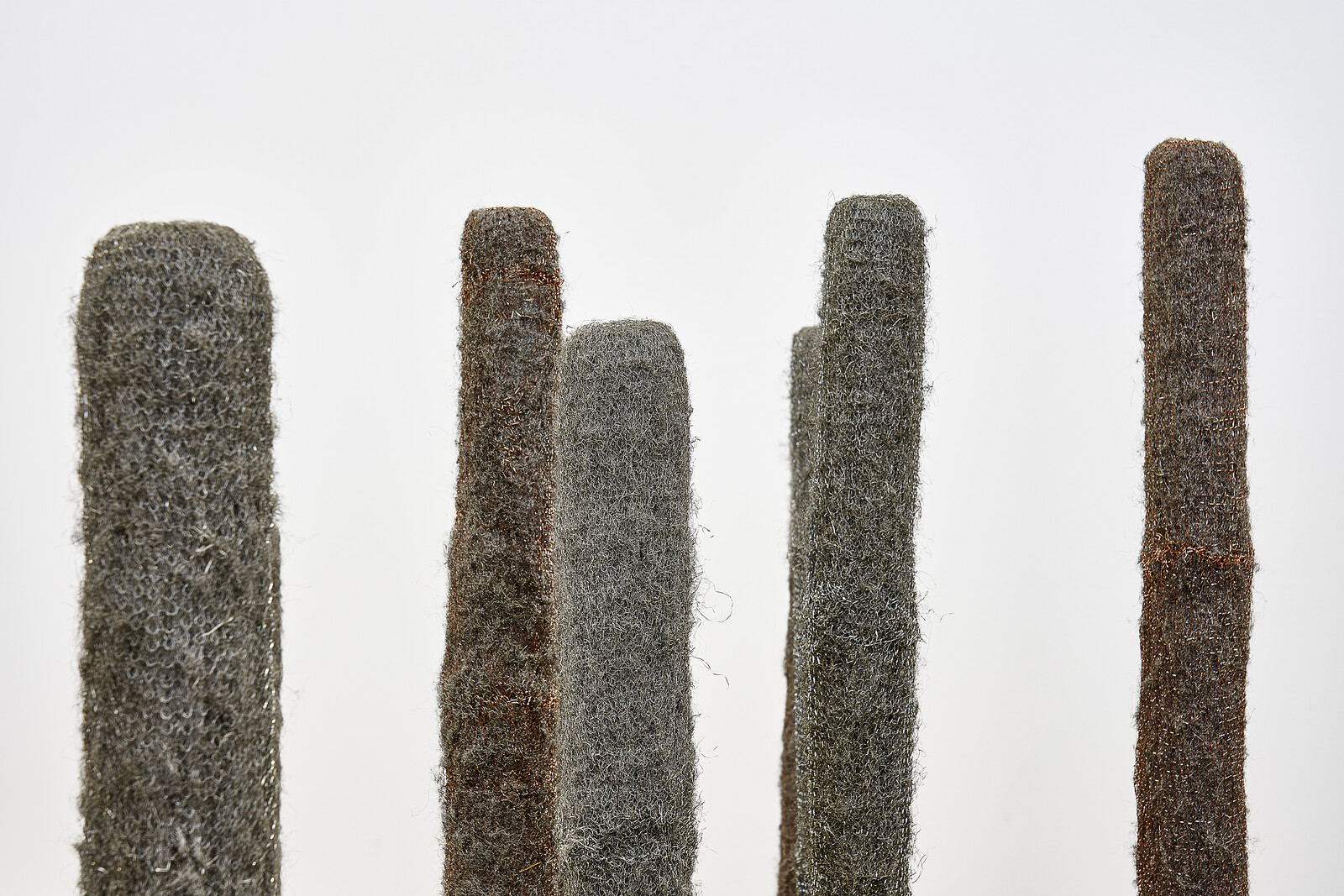 Axis is a signifier in sculpture, and South African artist Bronwyn Katz has a history of making resolutely vertical sculptural pieces. Installed in the main gallery of her phonetically engaged exhibition “/ // ! ǂ” at Blank Projects are two dozen slender columns made of steel wool and cardboard, their gray surface covered with a weave of raspy copper mesh. Flanked by three flowing wire tapestries of variable lengths and widths, titled kx (i)–(iii) (2019), the vertical form of Katz’s enigmatic floor piece, x (2019), recalls her breakthrough BFA work, Ouma Grootjie [Grandma] (2015), a freestanding column made of gray bricks and green soap blocks that, still now, reads as steadfast exclamation mark from a year colonial statues were toppled in South Africa.
