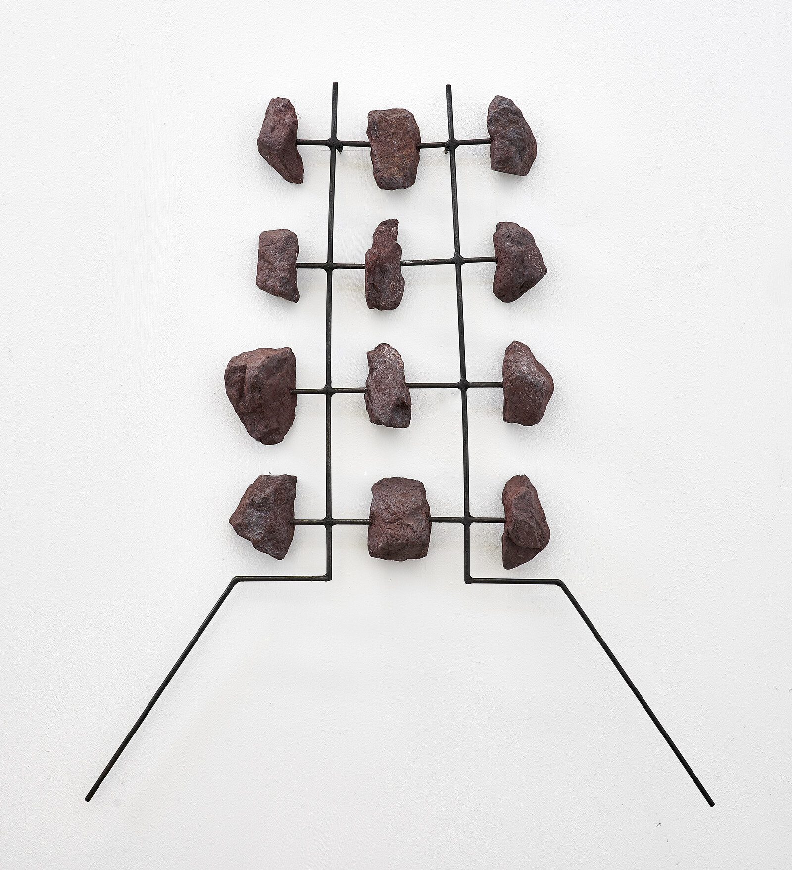 Arguably the most striking feature of Katz’s sculpture is her acute materialist sensibility. It is announced at the entrance to her exhibition with ore (2019), a wall-mounted piece composed of a grid display of 12 iron-ore pieces, each of the deep-purple rocks measuring roughly the size of a goose egg. The work invokes a recurring theme in her practice: land. Katz was born in Kimberley, the site of South Africa’s first colonial-era mining boom. The region around this city is also home to numerous petroglyphs, compelling figurative and abstract inscriptions on terrestrial rocks that collectively function as a codex for South Africa’s first people.