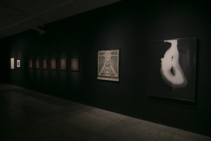 The diverse theologies and philosophies that informed Conner’s work resonate with Manila’s conflicted history. For centuries, the city was under the control of local rajahs until Spain colonized it in 1571. They brought Catholic beliefs that merged with the animistic religions of the indigenous population, resulting in the folk Catholicism practiced in the Philippines today. Catholic and Chinese imagery—a common fusion found across the religious practices of Catholic Chinese Filipinos—are present in TEARDROP ANGEL (1974). In this photogram, Conner’s body is captured as a ghostly, light-filled image with a long beard and hair resembling Christ. Bent forward at the waist, his hands grip his ankles—but the image is upside-down, so that his body (as the title points out) resembles a teardrop. The spectral, monochromatic image brings to mind both the Shroud of Turin and the yin-yang symbol, while Conner’s body resembles an embryo as well as a corpse.