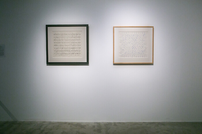 Close by is “Set of Six: 601–606” (1970), a series of lithographs depicting dense, complicated patterns of circles and triangles, the result of a labor-intensive technique of building up an image out of hundreds of individual black marks. Conner conceived of these images, which resemble mandalas, the religious emblems used in meditative practice, as an externalized representation of the human psyche, an individual expression of the collective unconscious. He spent hours obsessively marking these labyrinthine forms. While their complexity invites for a meditative concentration in viewers, producing them must have constituted a form of meditation in itself, of attaining a trance-like state through repetitive actions.