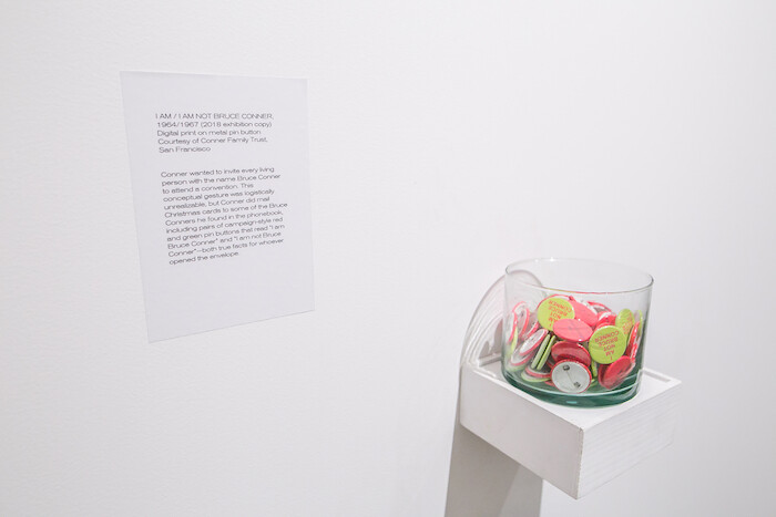A restless iconoclast who despised the market-driven art world, in 1963, the artist conceived of a grand convention to which he would invite every living person called Bruce Conner. It never happened, but that Christmas he mailed out pairs of badges to several namesakes which read, respectively, “I AM BRUCE CONNER” and “I AM NOT BRUCE CONNER,” pink and orange replicas of which are displayed in a glass vase in the gallery (I AM / I AM NOT BRUCE CONNER, 1964–67). A year later, in 1964, Conner abandoned the macabre, found-object assemblages for which he was best known, and in 1999, after pretending to retire from art, began making work under pseudonyms. At times, his efforts at self-effacement took on a melancholic quality. His final film, EASTERN MORNING (2008), is projected in a nearby room. This mystical journey of pulsating lights and colors ends with an image of a nude female standing in a chair. She disappears from the scene, leaving an evanescent memory.