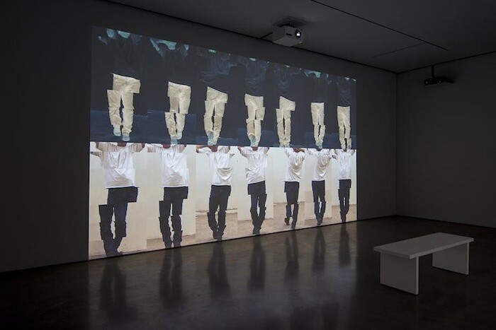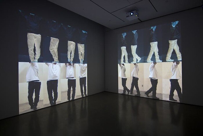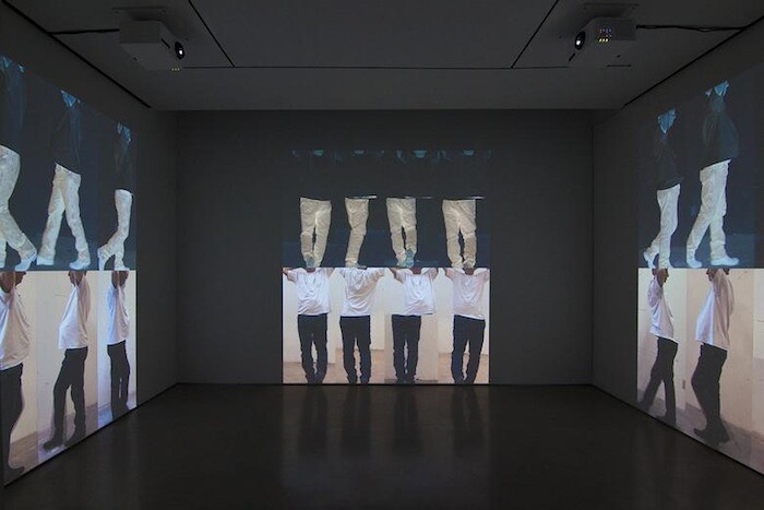 The installation Contrapposto Studies i through vii at New York’s Sperone Westwater (the Philadelphia Museum of Art is showing an alternate version, Contrapposto Studies, I through VII [2]) is an elaborate remake of that early video, and Nauman’s first major work since he represented the US in the 2009 Venice Biennale. The new Contrapposto Studies sum up his lifelong concerns while providing a fuller experience than the original work. In the context of a different century, these seven large-scale, high definition projections with sound revel in the aspect of time as it breaks through the limits of video space. Time disintegrates the moving figure of the aging artist, it wraps around his body, dematerializes its singularity, fragments his figure beyond comprehension. If the principle of Contrapposto added the potential of movement to figural sculpture, it also hinted that a statue need not be an inanimate object: it could contain the germ of motion, could question stasis and time itself. If Marcel Duchamp’s Nude Descending a Staircase, No. 2 (1912) raised a similar question at the start of the modernist century, Nauman, using his own body as the moving artwork, raises the dilemma anew in our own increasingly anxious context. He progressively slices and dices his own image by means of the filmmaker’s time-enabled and time-defying craft: the edit, the cut, the juxtaposition, the mismatched image. Nauman moves in these seven studies from a simple dichotomy of positive and negative, forward and backward, to increasingly complex forms of rotation and simultaneity. Progressing through them, you can’t help feeling that time is mocking space.