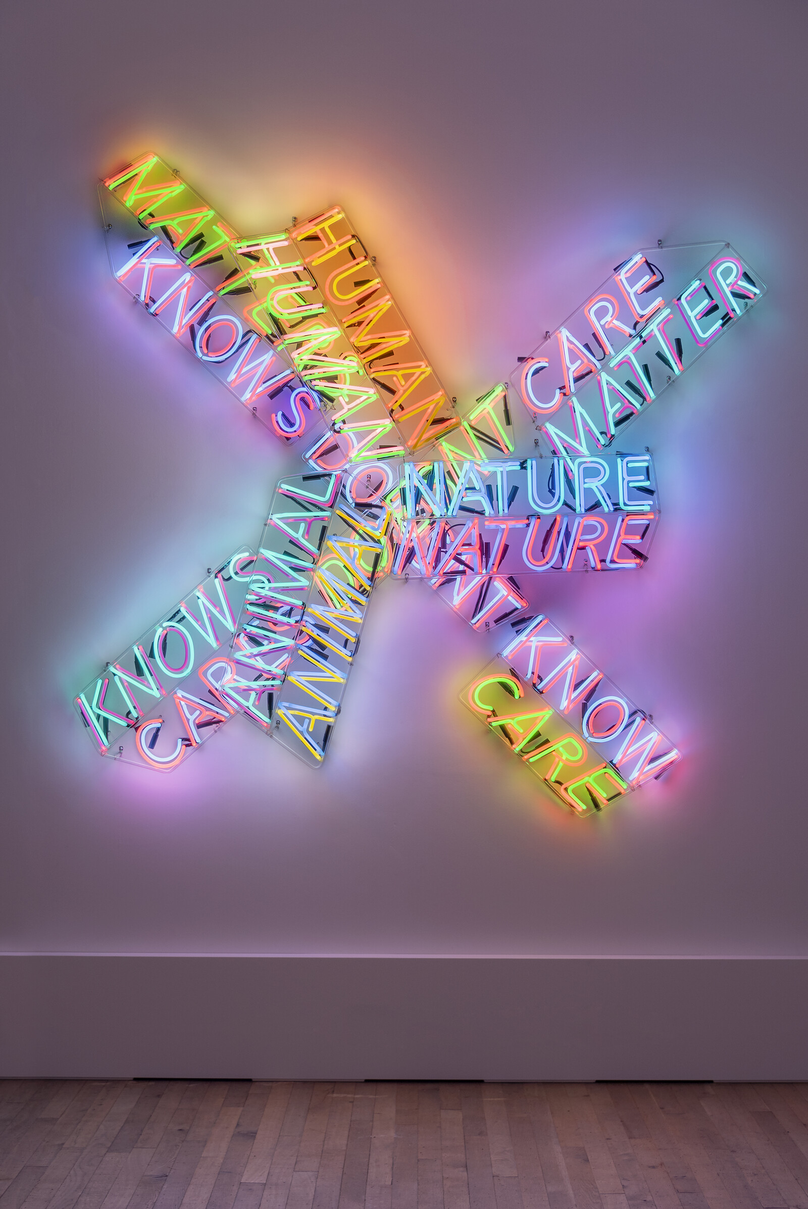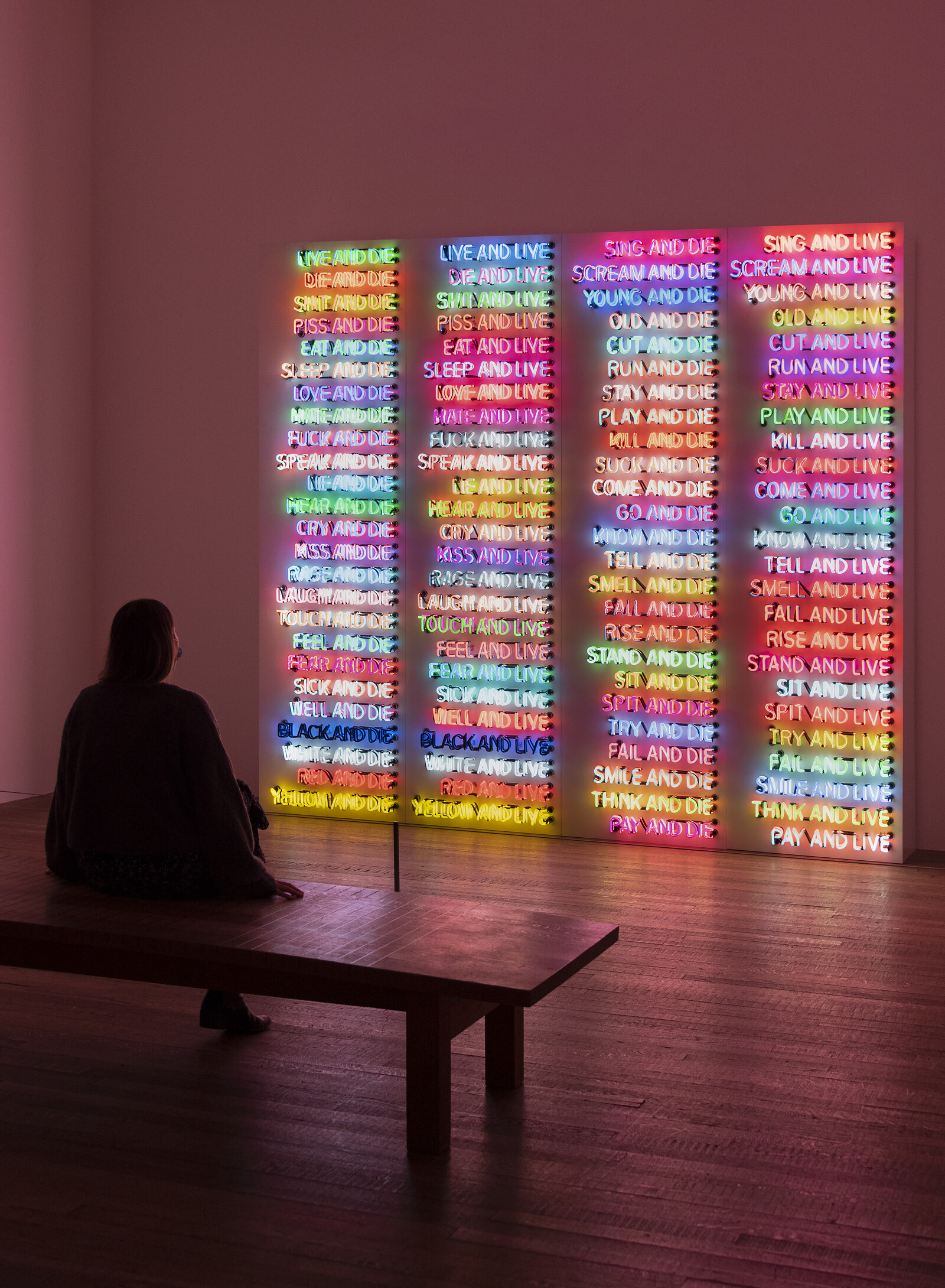 Nauman’s ultimate concern is not with the nature of who we are, but whether, more bleakly, we still care about asking that question. In one room, the neon piece Human Nature/Knows Doesn’t Know (1983/86) displays various permutations of text: “Human / Animal.” “Knows / Doesn’t Know.” “Cares / Doesn’t Care.” While I watched it flash on and off, a girl took a video of a friend as he posed against its pink and violet colours: the perfect TikTok. We are all Nauman’s children now, producers and consumers of infinite loops of video; yet we won’t be for much longer, as any trace of discomfort disappears in the bright glow of posts, shares, and the one emotion social media demands of us: likes.