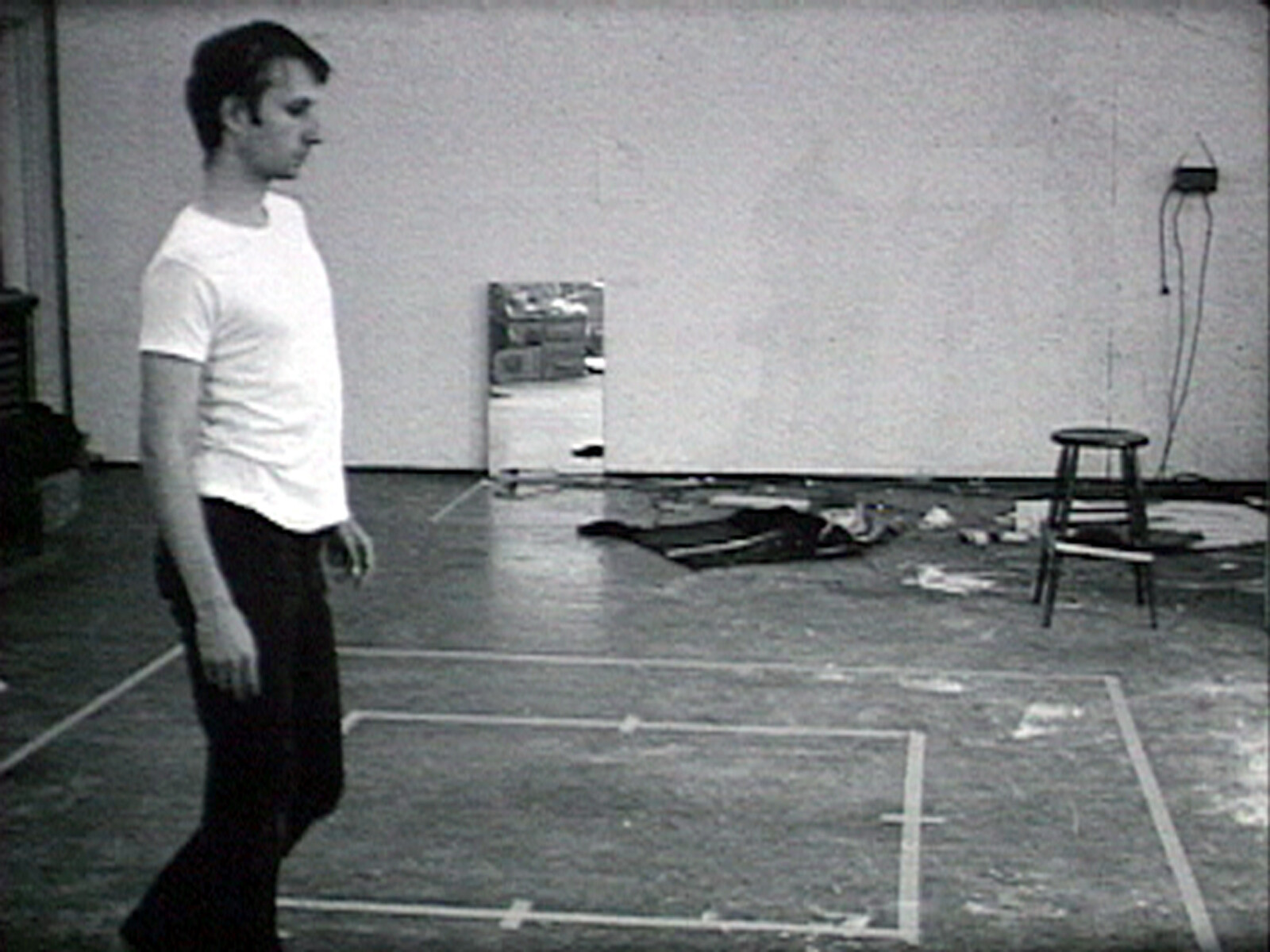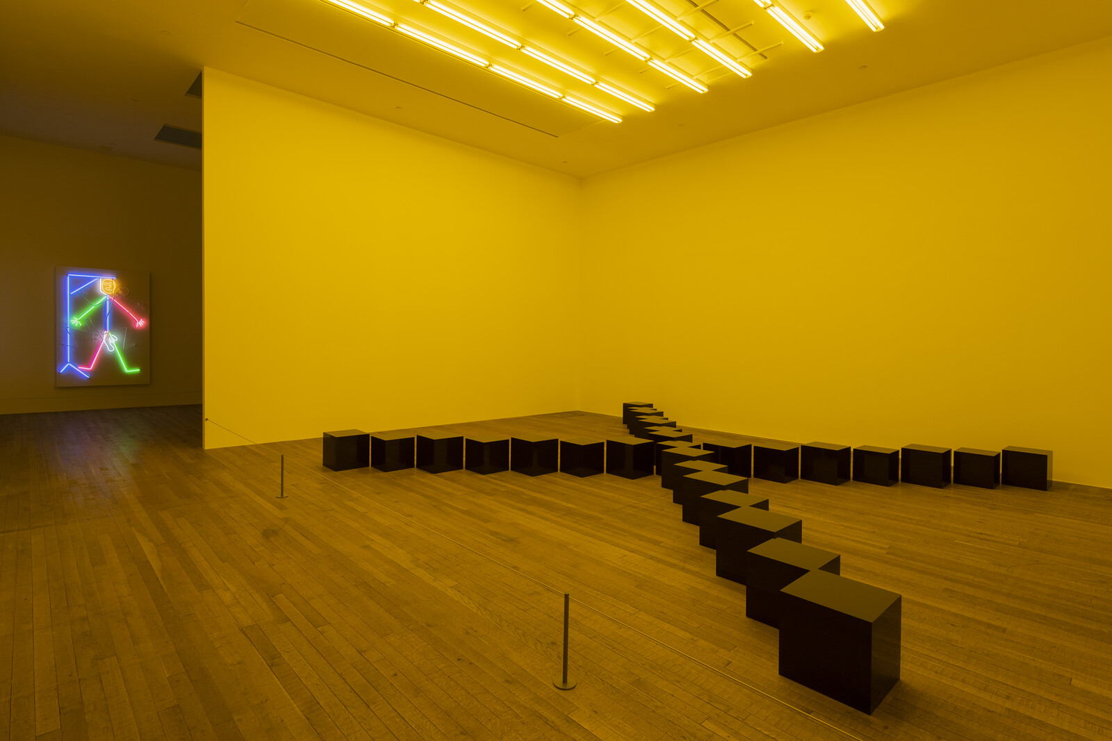 Inside the exhibition, a gentler introduction into this world of discomfort is provided by MAPPING THE STUDIO II with color shift, flip, flop, & flip/flop (Fat Chance John Cage) (2001), an installation in which seven recordings of Nauman’s studio, each lasting five hours, are projected onto four walls of a gallery. You have to strain—either by constantly turning around, or staying for hours—to catch the moments when Nauman himself flits by. The room reveals a concern with discomfort in art’s production as well as its consumption; a line of inquiry which, as the next room shows, began with his earliest work. In the video Wall-Floor Positions (1968) the artist holds poses until he falls over; in Bouncing in the Corner, No. 1 (1968), he endures dull repetitive pain. In Walking in an Exaggerated Manner Around The Perimeter of a Square (1967–68), slow walking produces a sashay of the hips that appears frequently in Nauman’s later work. This walk elicits the unease spelled out by a neon piece in the same room: Run From Fear, Fun From Rear (1972). The body of the effeminate man enjoying himself is also that which exposes him to danger.