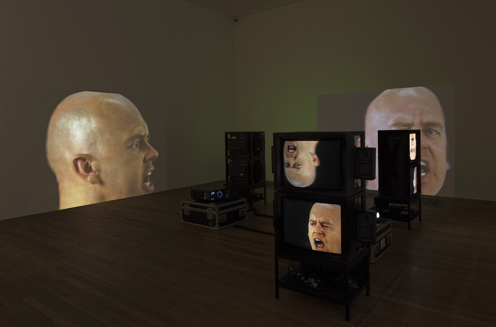 And so, like the head turning in the monitors and projections of Anthro/Socio (Rinde Spinning) (1992), we see that discomfort as a state of aesthetic reception is bound up with a world defined by a concern with the individual self (does any Nauman video feature two people interacting?). The spinning heads shout “Feet Me, Eat Me, Anthropology!” and “Help Me, Hurt Me, Sociology!” Can such rational knowledge tell us why we enjoy suffering—our own as well as others’? But it is impossible to use this art to think, so loud and unsettling is the noise produced by the screaming heads.