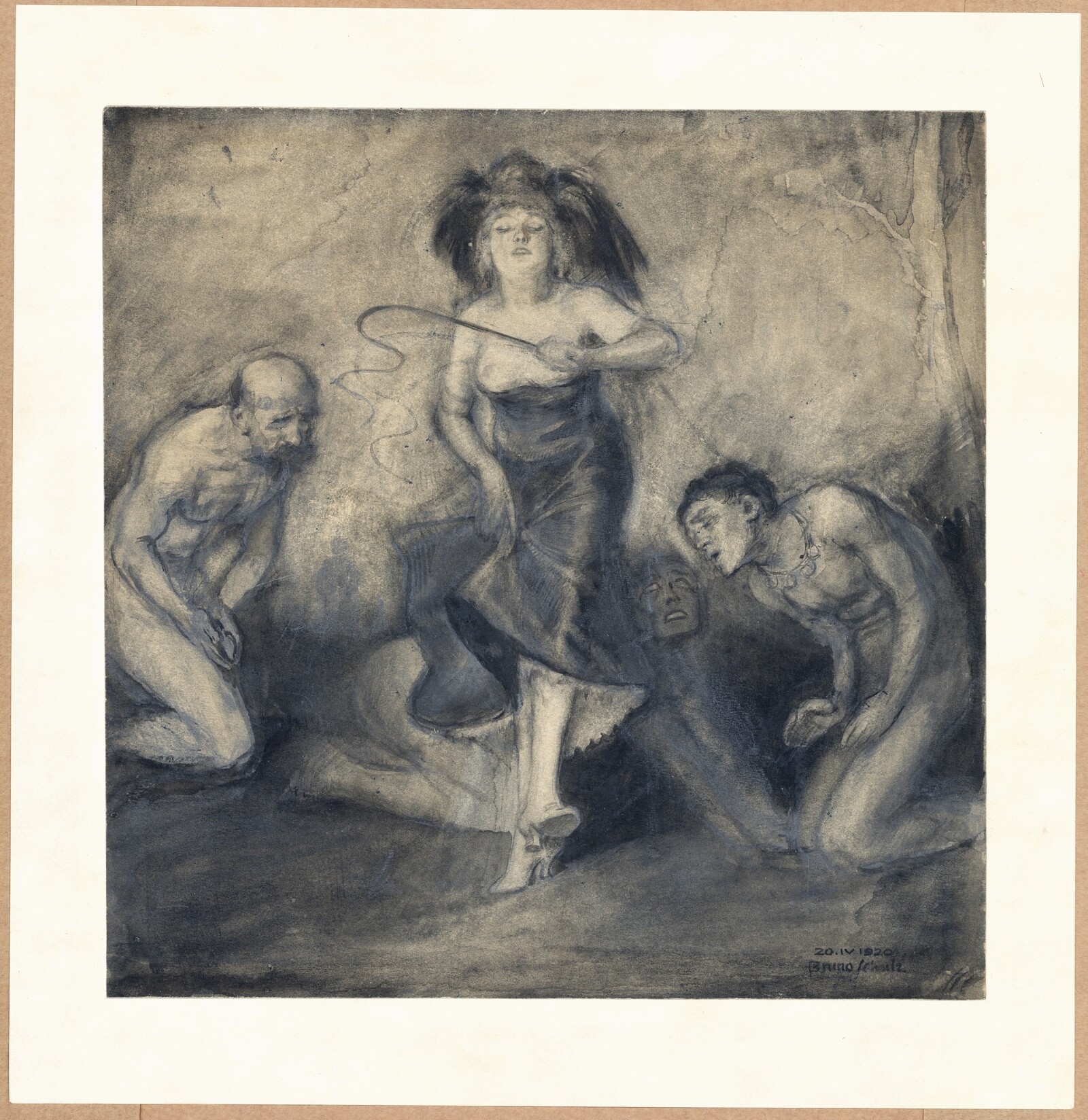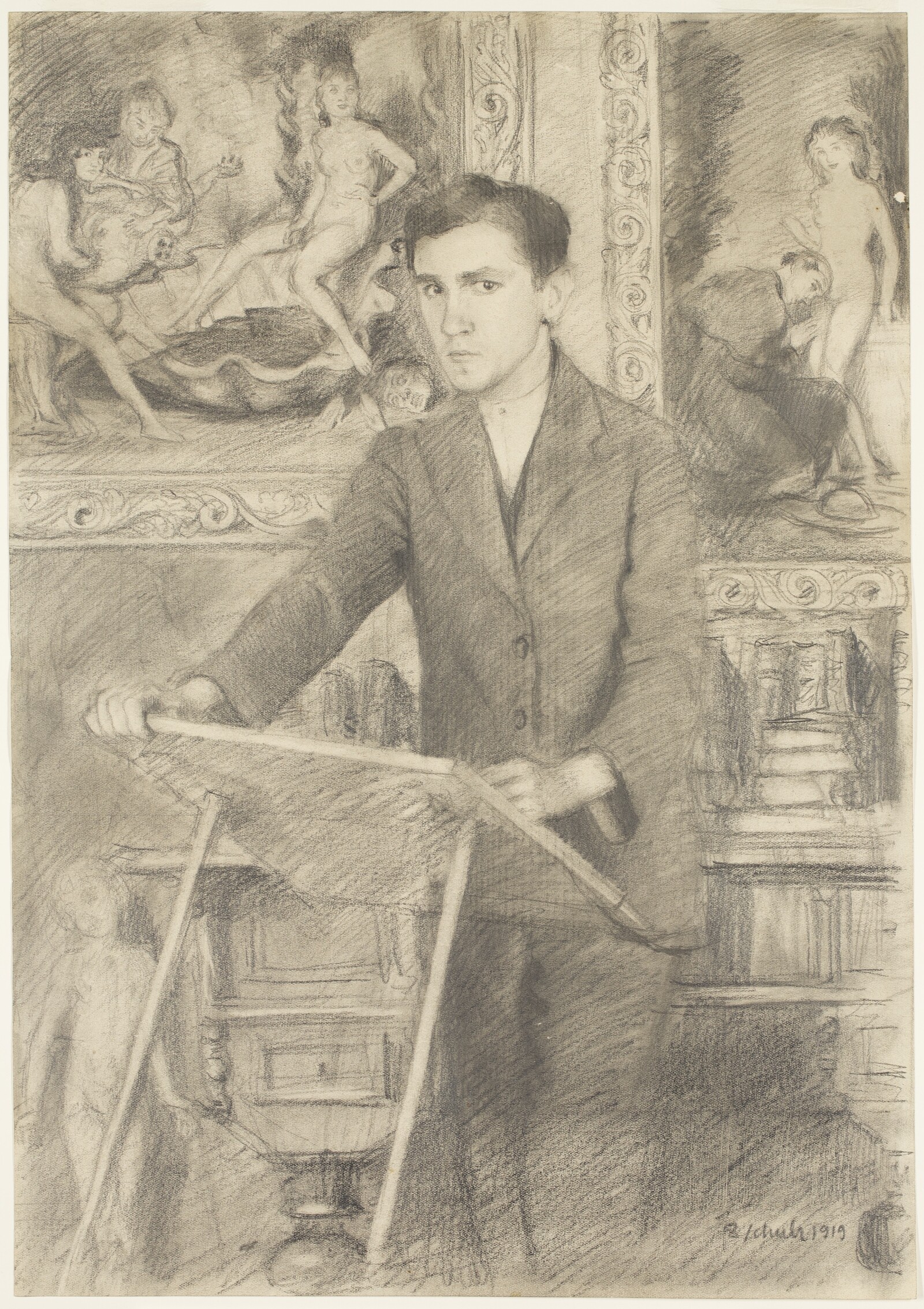 The title of the show is sourced from an interview with the artist in which he suggests that artists tend to explore a limited number of subjects across their creative lives.2 The exhibition charts the handful of visual themes towards which Schulz leaned—genre scenes against a city background, or conversations set in tiny rooms—but his overarching subject, returned to obsessively, was the depiction of gendered power dynamics. The opening work—a 1919 self-portrait in pencil on paper—serves as a good example. Here, we see the artist, his gaze fixed on the beholder, leaning in front of a drawing board. The room he is in resembles a fanciful stage set, with a heavy bookshelf and compositions in ornamental frames in the background: one depicts naked women frolicking around a basin, while another shows a man in a clerical attire, bowing to a female figure. At a first glance, women—as addressees of male worship— seem all-powerful in Schulz’s realm. But we cannot forget that it is a man, the author in the foreground, who constructs this fantastic scenery.
