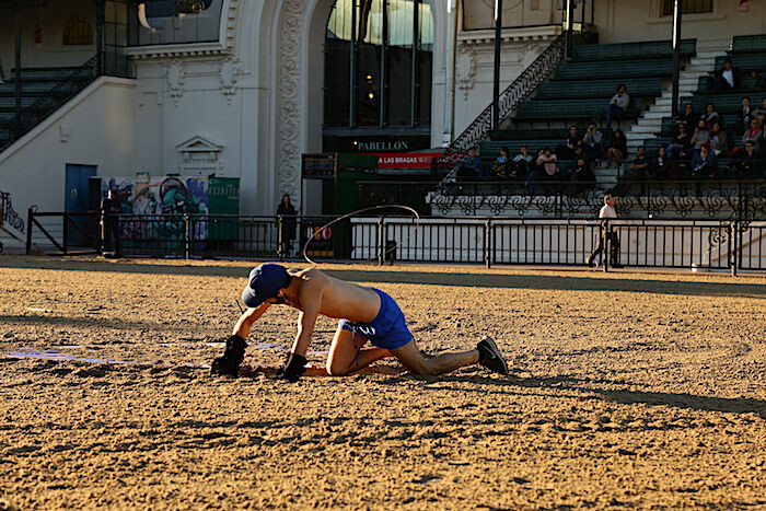 This is the phrase that appears on a billboard above the bleachers at the central courtyard of La Rural fair and congress center, a neuralgic space of Argentine agricultural policy with deep symbolic and affective roots. On May 23, in the same space where several Argentine presidents—from Juan Domingo Perón to Mauricio Macri through Jorge Rafael Videla and Cristina Kirchner—have given impassioned speeches to the masses, several roller derby skaters circled around, while in the arena artist Osías Yanov made holes in the ground using different geometric iron structures, simulating a kind of acupuncture on the site.