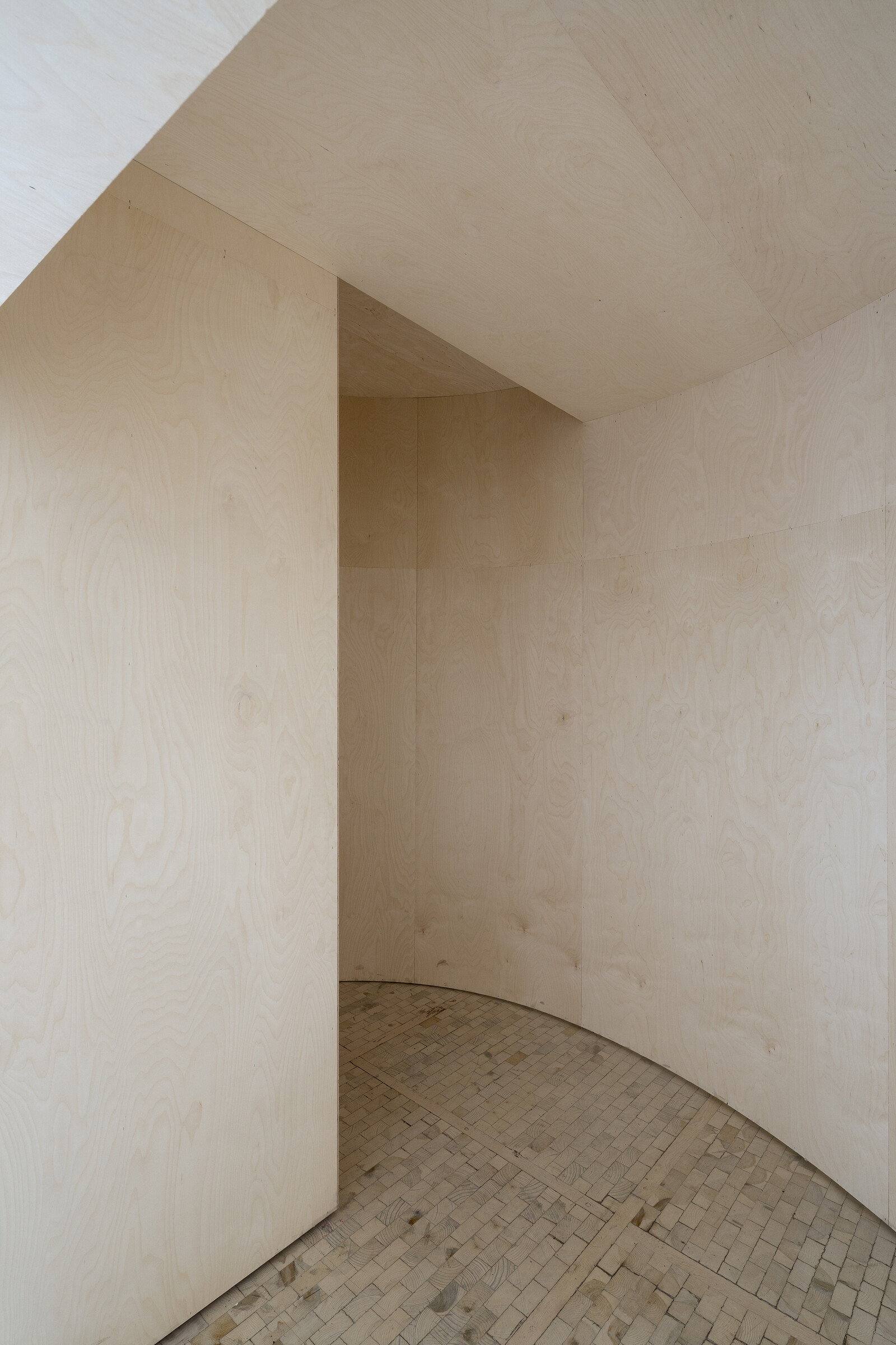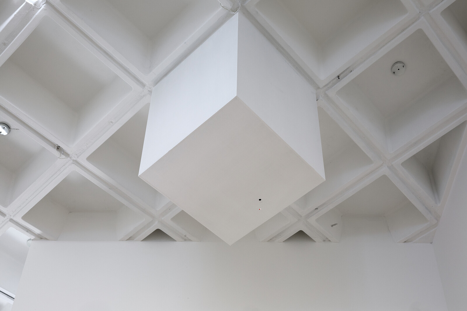 What followed, after stepping onto the roof, was the most disorienting and, perhaps, exciting moment of the show. As I reentered the museum, I was confronted with Swinging Spiral (2010/2019), a cylindrical wooden structure that gives the optical illusion of walking through a spiral room that gets increasingly smaller and smaller. The illusion is effective. I was taken aback by a moment of disbelief when I found out it was a ruse by the end of it, leading me back where I started. Leaving the space—which involved inching through a narrow space between a wall and Swinging Spiral—I finally entered the main gallery, where all the other artworks in the show are located and forced into a fixed theme: altered states of consciousness and the simulation of recreational drug use in a public space (i.e. a museum).