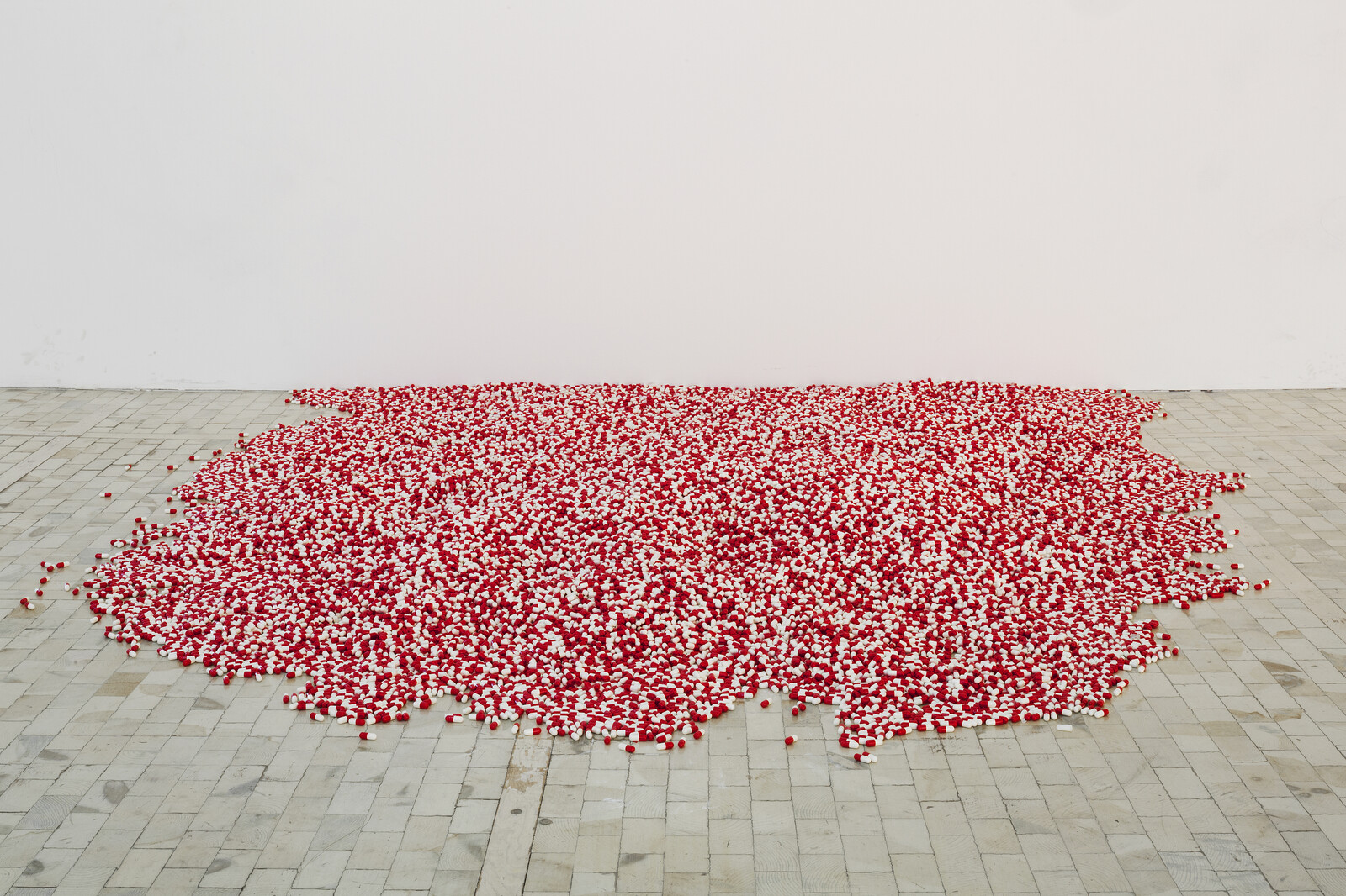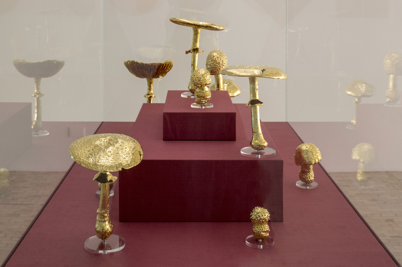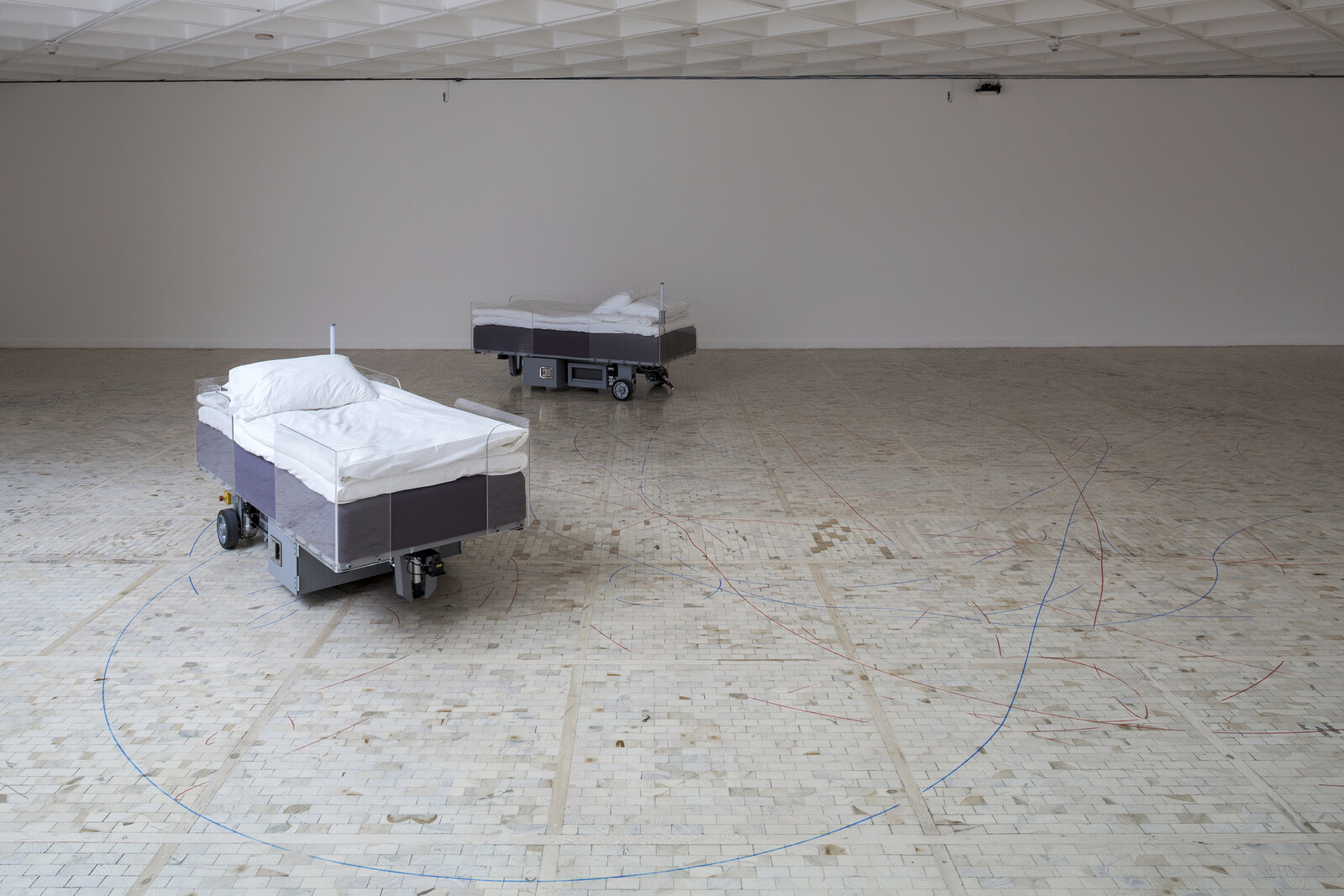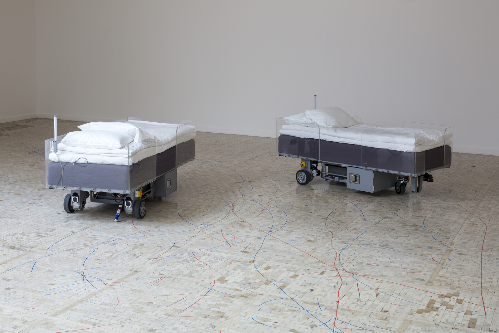 This is exemplary of works like Light Wall (2000/2017), a wall of strobing light bulbs that aims to induce hallucinations and/or nausea; Pill Clock (Red and White Pills) (2015), red-and-white capsule pills that fall from the ceiling into a pile on the ground à la Felix Gonzalez-Torres, and which Höller has cryptically suggested are laced with some type of hallucinogenic (viewers are invited to ingest one); 7,8 Hz (Vitrine With Golden Fly Agaric Mushrooms) (2019), a collection of small gold-plated psychedelic mushroom sculptures; and Upside-Down Goggles (1994–ongoing), eyepieces that literally turn the world upside down. Even Two Roaming Beds (Grey) (2015), a set of robotic beds that constantly move across a room, streaking the floor with red and blue ink, incorporates some use of mind-altering substance. Visitors can book an overnight stay in the two beds, complemented with a “dream-enhancing” toothpaste to further their experience. The cost of doing so is 5,000 MXN (roughly 260 dollars)—a far cry from Höller’s Revolving Hotel Room (2008), which invited visitors to spend the night at New York’s Guggenheim Museum for up to 799 dollars per person as part of the 2008 group show “theanyspacewhatever.” And perhaps a crucial difference lies in the contrast in scale, both in size and extravagance. Until recently, Höller’s work has been of epic proportions (think of Test Site, the massive corkscrew slides he installed in the Turbine Hall of London’s Tate Modern in 2006, or Soma [2010], an installation that at the Hamburger Bahnhof in Berlin housed 12 live reindeer among other animals). Stripped of opulence, however, the work’s hollowness is laid bare.