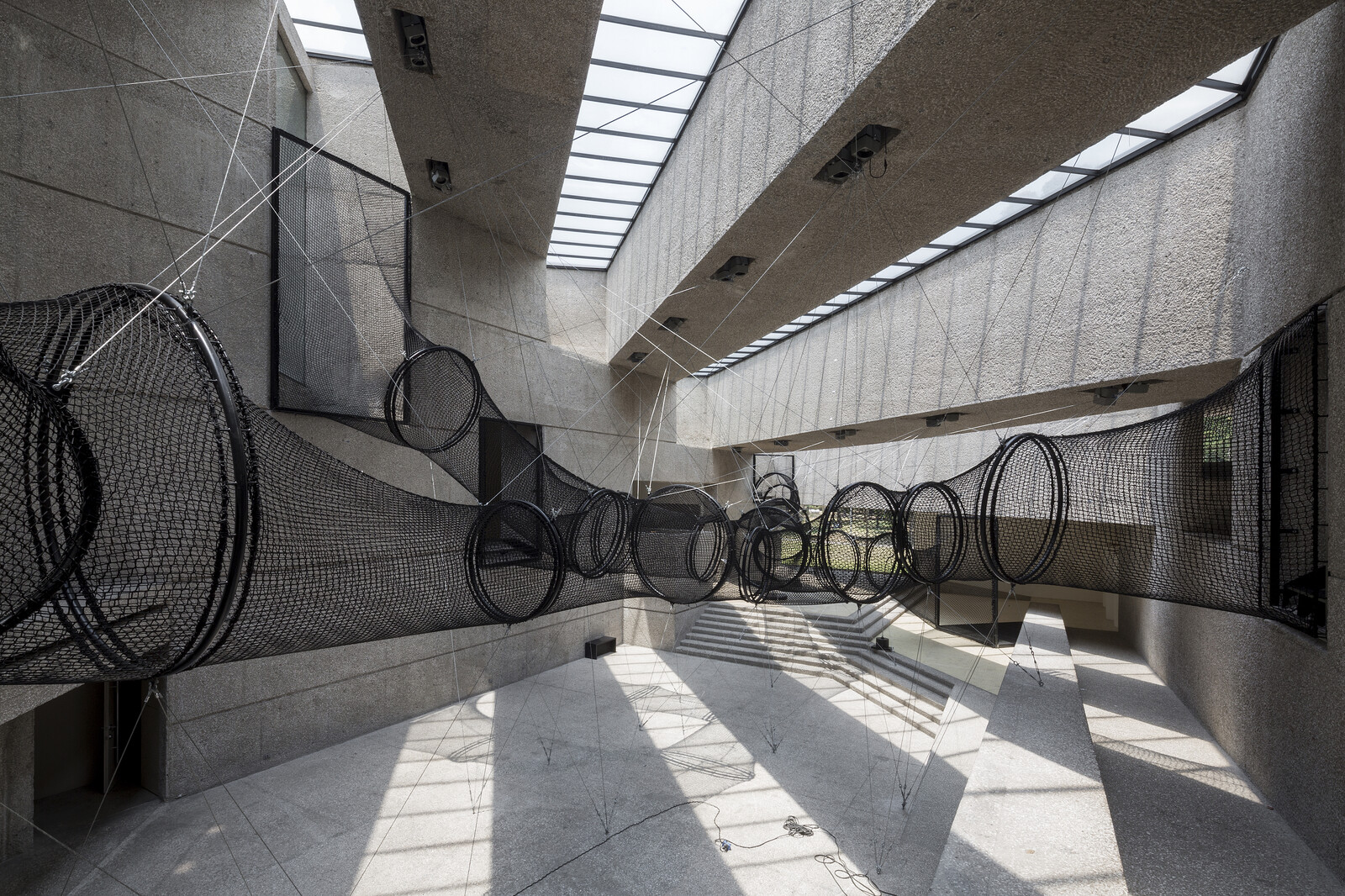 This is not to say that Decision Tubes (myself and a group of friends finally decided to wait in line, begrudgingly) doesn’t spark a certain childlike glee, or at the very least a novelty experience, when awkwardly squirming through it. The work reminded me of a McDonald’s PlayPlace at every turn—a play area that most American children who grew up in the 1990s can remember with great fondness. But unlike its predecessor Decision Corridors (2015), a maze-like structure of galvanized steel, Decision Tubes pushes viewers in a specific direction. At different outlets museum guards urged me back into the mesh tubes to eventually find myself on the roof of the museum, leaving the experience of the piece woefully contrived.