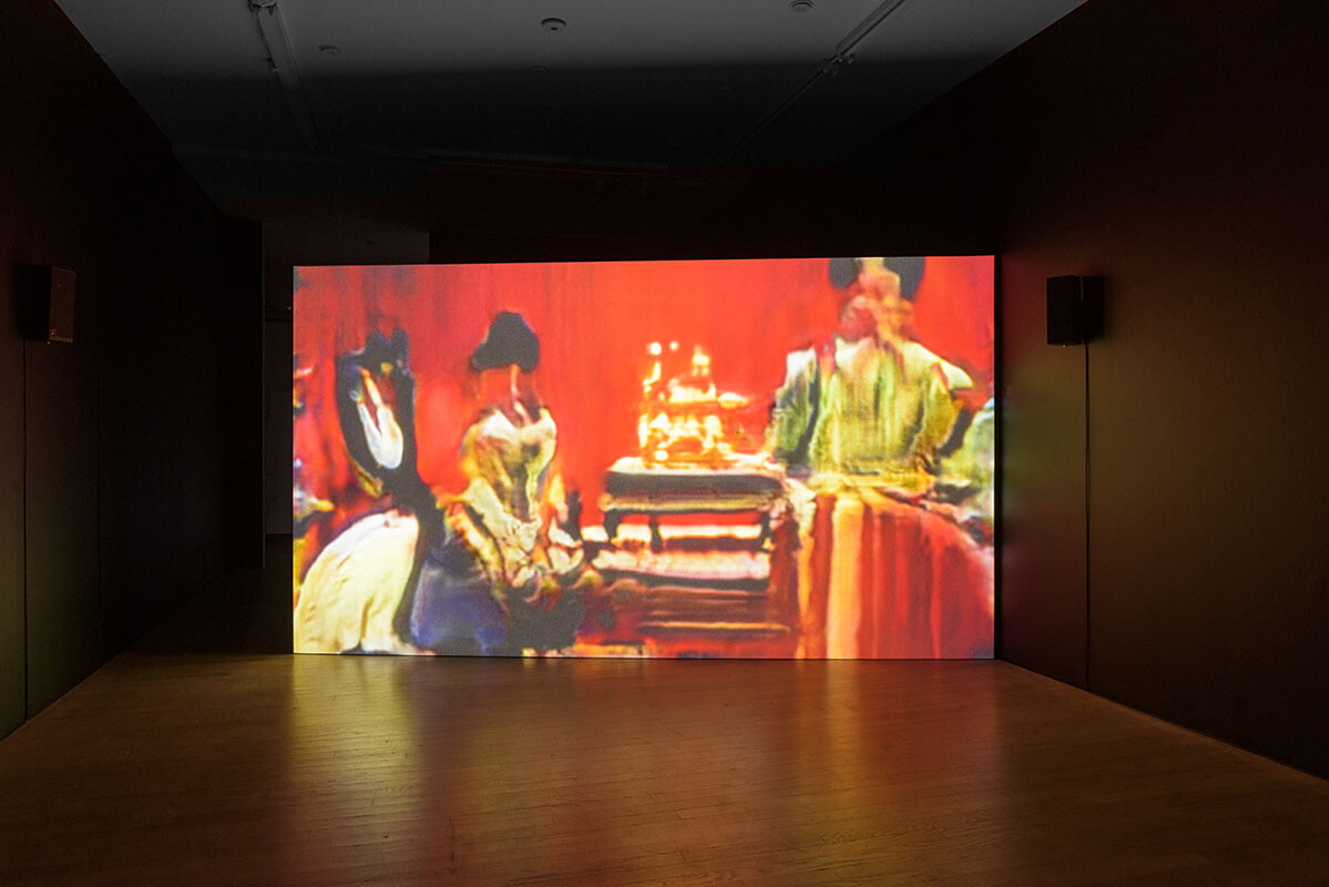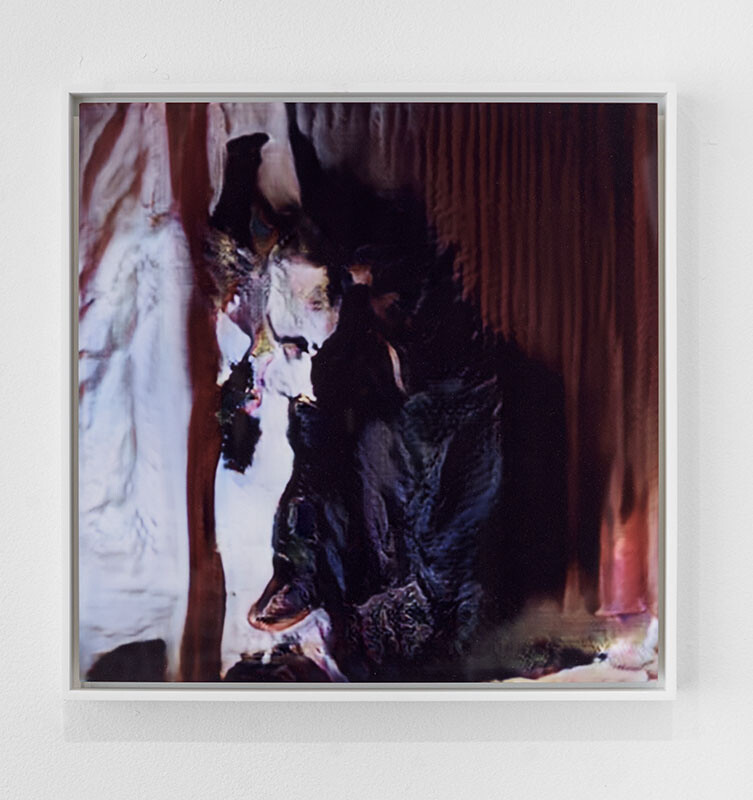 Werner’s music—created with granular synthesis, a process that takes microscopic samples of sound and allows the musician to time-stretch, pitch-bend, EQ, cut-up, loop, and modulate them with all manner of audio effects in real-time—sets a jittery tempo for the videos. In another room in the gallery are freestanding screens, onto which Reas has projected a series of untitled, animated video works made using GANs. To create each frame, the artist processed thousands of photographs, paintings, and film stills, resulting in distorted images that are completely new while remaining eerily familiar. Seamlessly animated and cut to Werner’s music, slight alterations in the GAN process create variations within each frame. Like Werner’s sound design, the objects depicted in Reas’s images distort, stretch, and twist until they become something new—or disappear. At first, I thought I was watching pure-abstraction—grainy and handmade, like a digital descendant of Harry Smith’s experimental films—until I believed I recognized the mouth of Johannes Vermeer’s Girl With a Pearl Earring (ca. 1665) emerging from the gray slurry. The facial features faded, and in their place appeared the hand of a small child reaching towards me with deformed, twitching fingers.