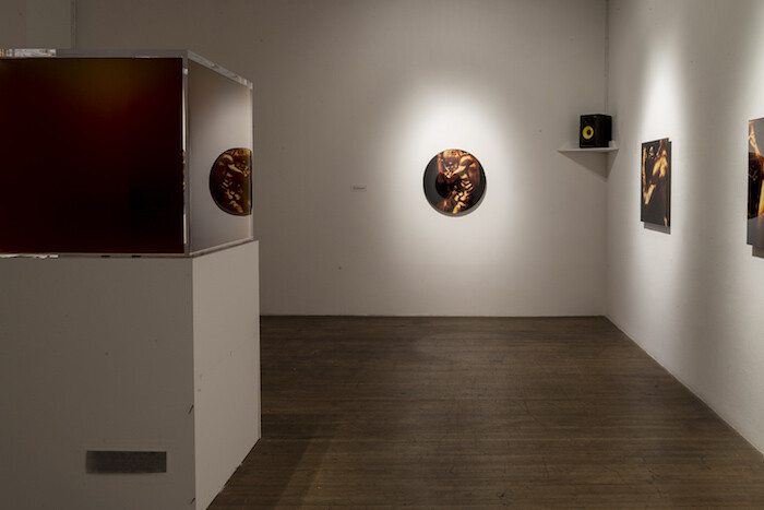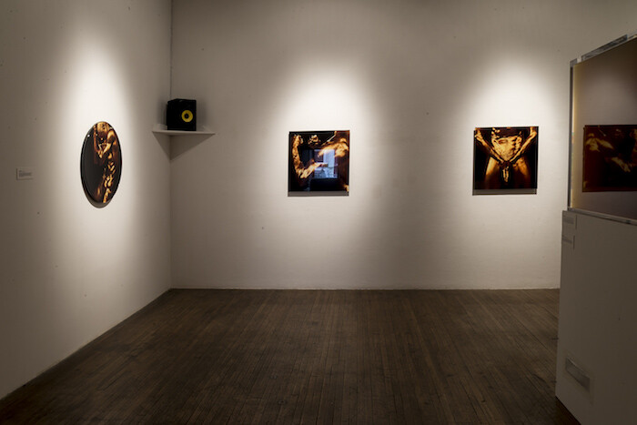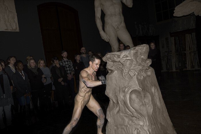 A suite of five photographs depicts the artist’s creation of Resilience of the 20%, punching and kicking their way through a ton of clay in total darkness. The only illumination comes from the hard flash of the cantilevered camera, capturing the artist and wide-eyed audience, as well as a cast of Michelangelo’s David (1501-4) behind them. Earlier this year, Cassils led a site-specific performance with Resilience of the 20% in Omaha, Nebraska, called Monument Push. A series of local activists pushed the 2200-pound bronze sculpture (including a 900-pound base) to unmarked sites of violence against LGBTQ people in the city. A documentary video about the performance, in the style and duration of a Vice clip, plays on a monitor and headphones opposite the photos.