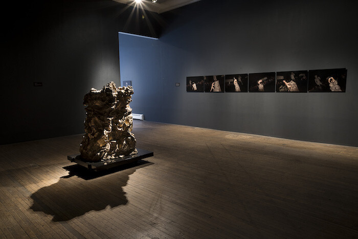 The practice of Canadian-born, Los Angeles-based artist Cassils expands upon—and queers—a feminist performance-art tradition, molding their transgender masculine physique through rigorous fitness regimens and durational actions. Though in “Monumental,” Cassils’s current New York exhibition, abstraction has entered the artist’s repertoire. Cassils grapples with their political desire to represent transgender lives and the media’s desire to spectacularize transgender bodies. The most traditional monument on display is Resilience of the 20% (2016), a bronze cast of a one-ton block of clay that Cassils attacked during a previous live performance in the Pennsylvania Academy of Fine Arts’s casting hall. The sculpture, which reveals impressions of Cassils’s hands, feet, and limbs, is spotlit at the center of a room painted a sober, dark gray.
