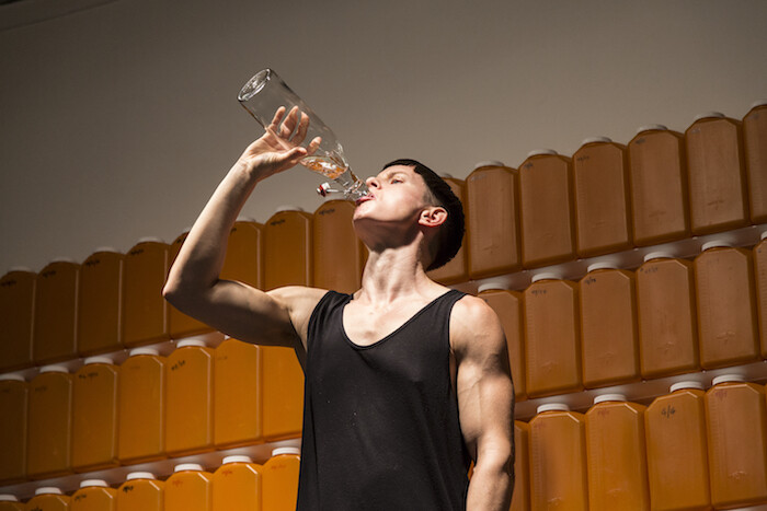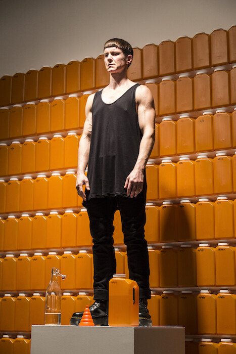 In PISSED (2017), Cassils returns to durational, private performance. The artist collected their urine for 200 days, in response to the US government’s decision to overturn an Obama-era executive order allowing transgender people to use the bathroom corresponding with their gender identity.1 A clear Plexiglas cube contains 200 gallons of the artist’s urine, preserved with boric acid (a roach killer), giving it the tinge of tea, which faces a floor-to-ceiling grid of disinfected orange urine containers. The ensemble is accompanied by a two-hour soundtrack of the court cases of Gavin Grimm, a transgender student from Virginia who was banned from using the boys’ bathroom at his high school. Grimm fought the school’s policy about utilizing the bathroom that corresponds with his gender assigned at birth up to the US Supreme Court, only to have the court refuse to hear the case this March.2 During the exhibition’s opening, Cassils performed the conclusion to PISSED on a towering white platform, dressed entirely in black. A living monument, Cassils chugged from a clear jug of water and peed into a funnel, covering their genitals with a long tank top, capping off the work by dumping their urine into the container.