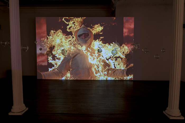 The 2015 video Inextinguishable Fire, which documents Cassils being doused in flames on a soundstage, at first appears to symbolize the ultimate hero complex. Filmed at 1000 frames per second, the video stretches the 14-second performance to 14 minutes, bringing to mind Bill Viola’s 1996 slow-motion video installation The Crossing. Cassils’s work, however, subtly deconstructs the myth of white maleness. It begins with an extreme close-up in the center of Cassils’s flame-retardant suit, the only sound the beating of their heart. As flames begin to lick the side of the frame, the camera zooms out, revealing Cassils with outstretched arms against a painted backdrop of a crimson sunset. The image of a white body in a white suit calls to mind associations from the beatific (Jesus) to the evil (KKK). At the end of the performance, two men in silhouette emerge from the sides of the frame to extinguish Cassils. The performance rewinds at a slightly faster speed, allowing viewers to catch details that might go unnoticed, like a tiny handheld fan wafting the flames. The performance underscores a truth in Cassils’s work: violence is as cyclical as it is mediatized. At the same time, it is no less real to its victims.