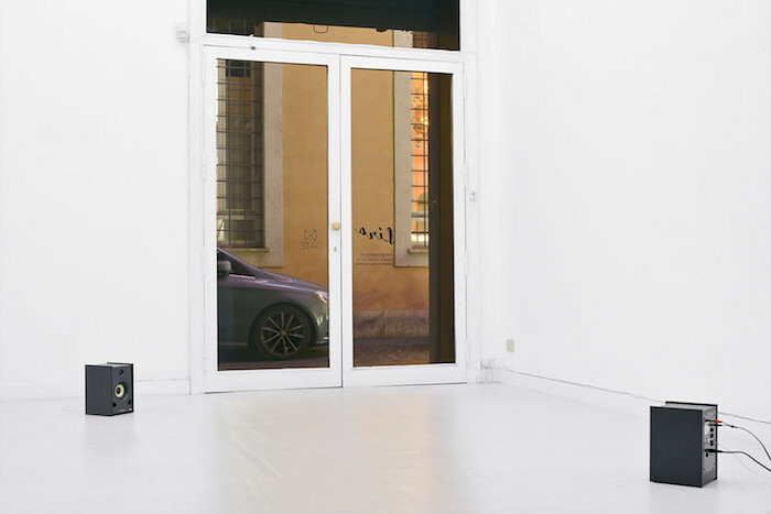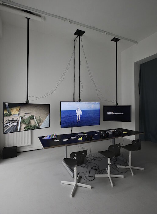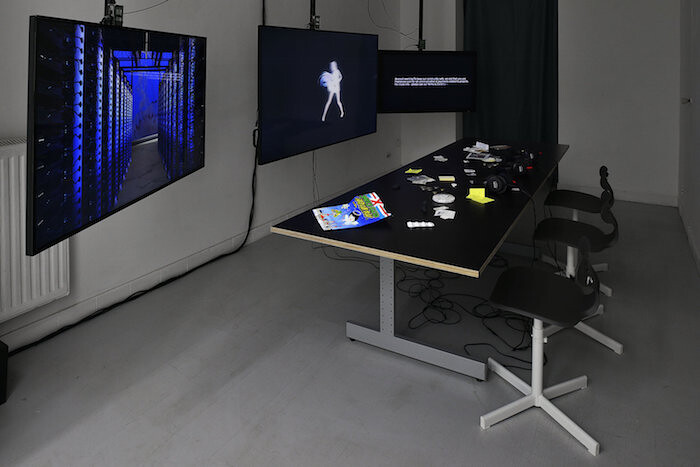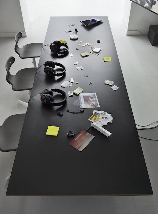 Moving from one screen to the other, the gaze falls on the table right below and starts noticing coins, an empty medicine blister, lens-wipes, a pill container, a bag of crisps, train tickets, metro cards, 3D-printed models of sculptures, Post-it notes, receipts. The table and chairs mirror those in Evans’s studio, so that viewers end up watching a reconstruction of a reality virtually happening elsewhere by means of their in-built oculi, their eyes. As if they were there too, in absentia. Well, maybe. Anyway, they are made to listen—full blast, thanks to a couple of loudspeakers installed at the entrance—to the playlist including all the tracks Evans’s team has been listening to while working on the video. With headphones on, instead, it’s the video’s immersive soundtrack that draws viewers in.