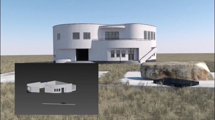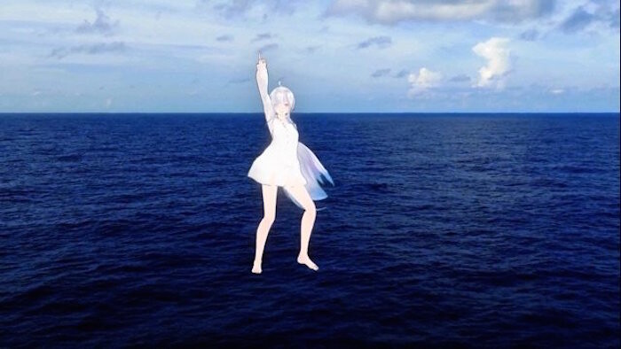 Some of the characters featured on the screens have been with Evans for years. Take HAKU, for instance, dancing in front of the blue waves of the sea, with her cerulean free-floating hair, who also appeared in Evans’s Softness in 2015: she’s a “humanoid persona” similar to Hatsune Miku, the Vocaloid singer (developed by the Japanese company Crypton Future Media) who performed during Lady Gaga’s last tour in Japan. Her pubescent body, kawaii and sexy, dancing to the users’ music, moving to meet their clicks, made her an instant commercial success upon release almost a decade ago. The same beautiful jellyfish fluctuating in Working on What the Heart Wants also appeared in Softness and in Evans’s 2014 video Hyperlinks or It Didn’t Happen, as did the sharks, now swimming in the shallow waters of a flooded shopping mall. There are also two romantic lovers, hugging and kissing. These figures are alternately backgrounded by scenes of wilderness, a white villa (Saltzman House, designed by Richard Meier in East Hampton in 1967), and the dark interiors of Mike Tyson’s apartment, with “Mis Hu” tagged on a mirror. Constant fragmentation does not allow any comprehension of the plot, and forces viewers, instead, to focus on the process of its generation.