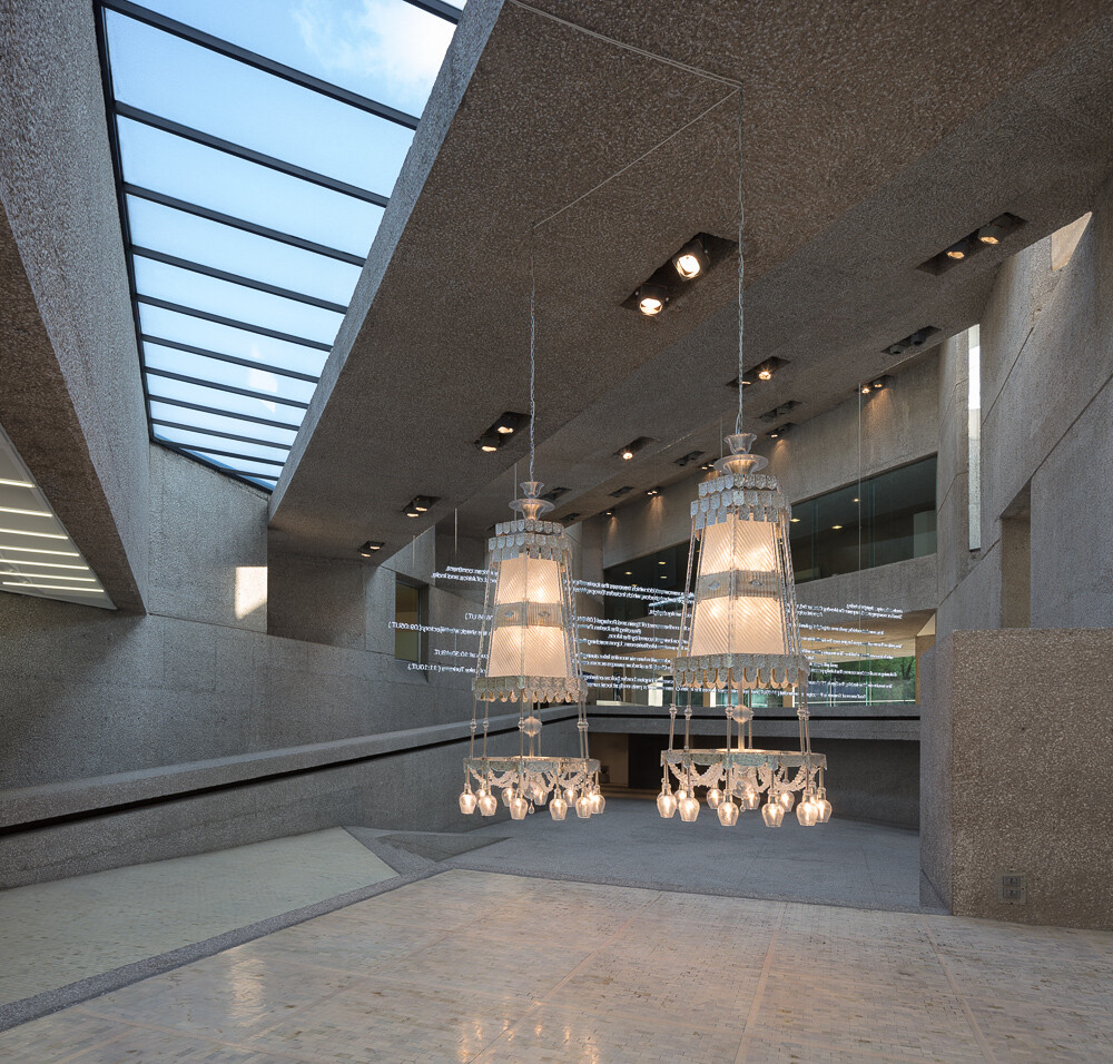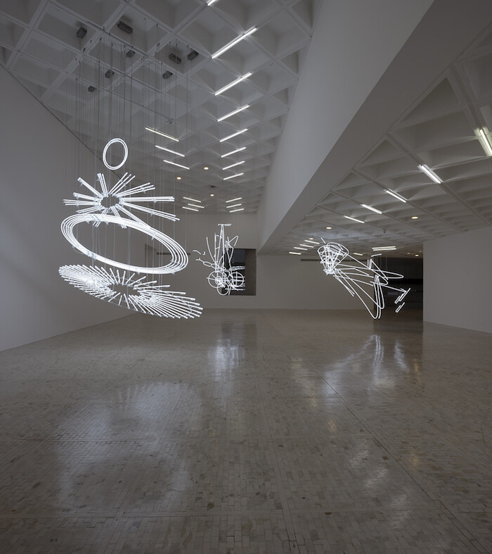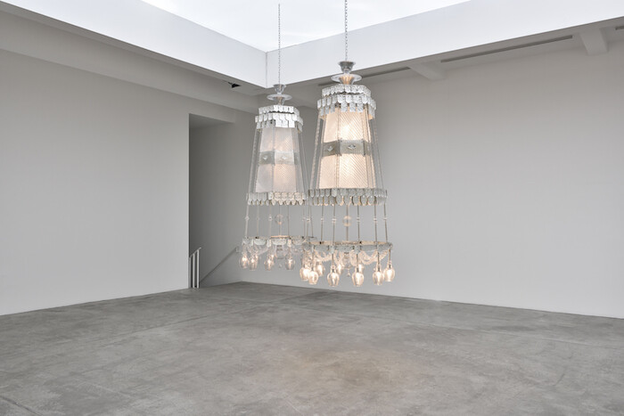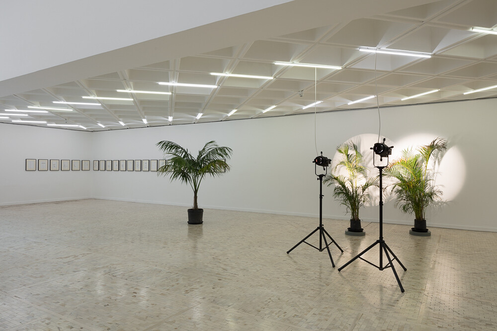 All that said, the mood of this elegantly detached show fluctuates between subdued spectacle and hushed liminality. A selection of twelve works from the past ten years, the exhibition is a sparsely installed affair. The main space features a trio of hanging neon light sculptures—Neon Forms (After Noh II), Neon Forms (after Noh III), and The Illuminating Gas… (after Oculist Witnesses) (all 2015)—as well as a sound work, T=R=A=N=S=F=E=R=E=N=C=E (Frequency shifting paradigms in streaming audio) (2012), which is placed in a corner and is so discreet that it is possible to miss. Allegedly referring to Noh theater and functioning as “scores,” both versions of Neon Forms leap down from the ceiling with a calligraphic and truncated dynamism which touches upon the lyrical. Meanwhile, The Illuminating Gas, which refers to the Oculist Witnesses in Duchamp’s The Bride Stripped Bare by Her Bachelors, Even (1915–23), consists of three, successive radial forms, which, incidentally, look like they could almost be a luminous still from László Moholy-Nagy’s 1930 film Light Play: Black-White-Gray. The lower level features the above-mentioned riff off of Broodthaers’s Un coup de dés jamais n’abolira le hasard (1969), entitled S=H=A=D=E (Evacuate) (2017), which essentially consists of the same work with Mallarmé’s text, which Broodthaers blocks out in black, here cut out (picture player piano music). Not far from these lurks yet another reference to the Belgian conceptualist and his Un Jardin d’Hiver (1974) in the form of Still life (in course of arrangement…) II (2015), which is comprised of two illuminated palm trees which rotate on turntables and cast shadows on the walls behind them. A nearby, hanging transparent sculpture, Composition for 19 Flutes (2015), whose fluid, curvilinear structure brings to mind an alien form, contains 19 different glass flutes which seem less to play a composition than to whisper some kind of glossolalia. Adjacent are a pair of hanging chandeliers, Sutra (Patio Central) and Mantra (Sala II) (both 2017), created according to the artist’s specifications by Galliano Ferro in Murano, which periodically flash on according to a piano composition written and played by the artist.