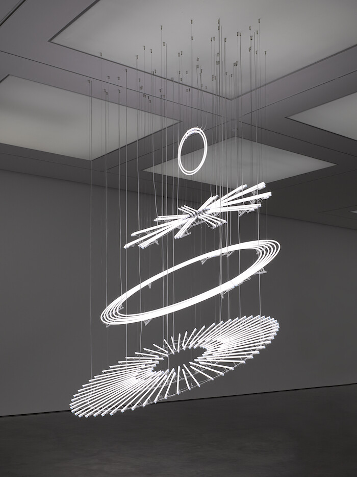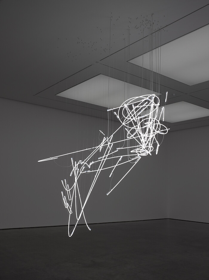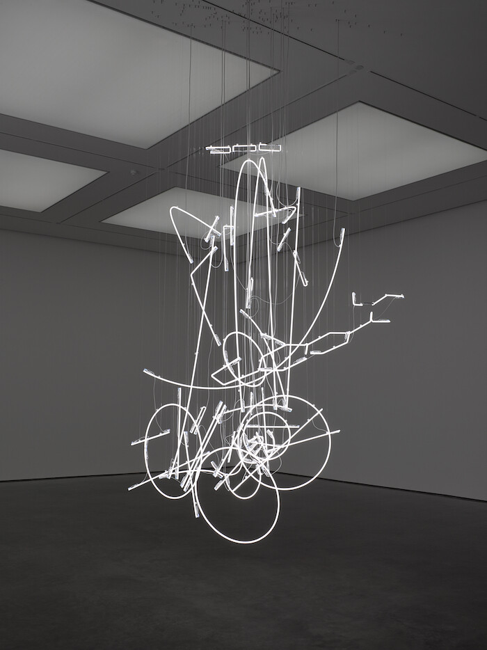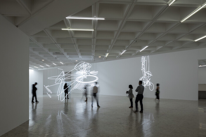I’m not usually a fan of art about art, for the simple reason that it tends to perpetuate the potential solipsism of a perilously self-involved discipline, but something about Cerith Wyn Evans and his consistent ability to transmute art-historical references into quasi-mystical arcana has always struck me as agreeably mystifying. As such, I feel like he cogently, if urbanely, conveys one of the greatest secrets of art: that it is a secret. Or at least this is what I tell myself while walking around his first monographic exhibition in Mexico, as people rush around to take selfies in front of elaborate neon sculptures hanging from the ceiling. Virtually and refreshingly devoid of didactic wall labels, the exhibition both secretly and not-so-secretly (if you are an adept of the cult of Art) teems with references to some of the more recondite practitioners of art in the 20th century. I can’t help but wonder how the general public gains access to works that directly cite Marcel Duchamp or Marcel Broodthaers? The short answer to my rhetorical question is: they don’t. And maybe that’s okay. Maybe it’s enough to obscurely intuit that just beyond the mere appearance of a given thing lies a vast, involuted network of history, aesthetic commitment, and cognitive labor? This is, after all, precisely what I look for when encountering art: I want to feel like an artist has placed a thing in front me which is like an endlessly strange and intriguing puzzle whose solution I can barely begin to fathom.