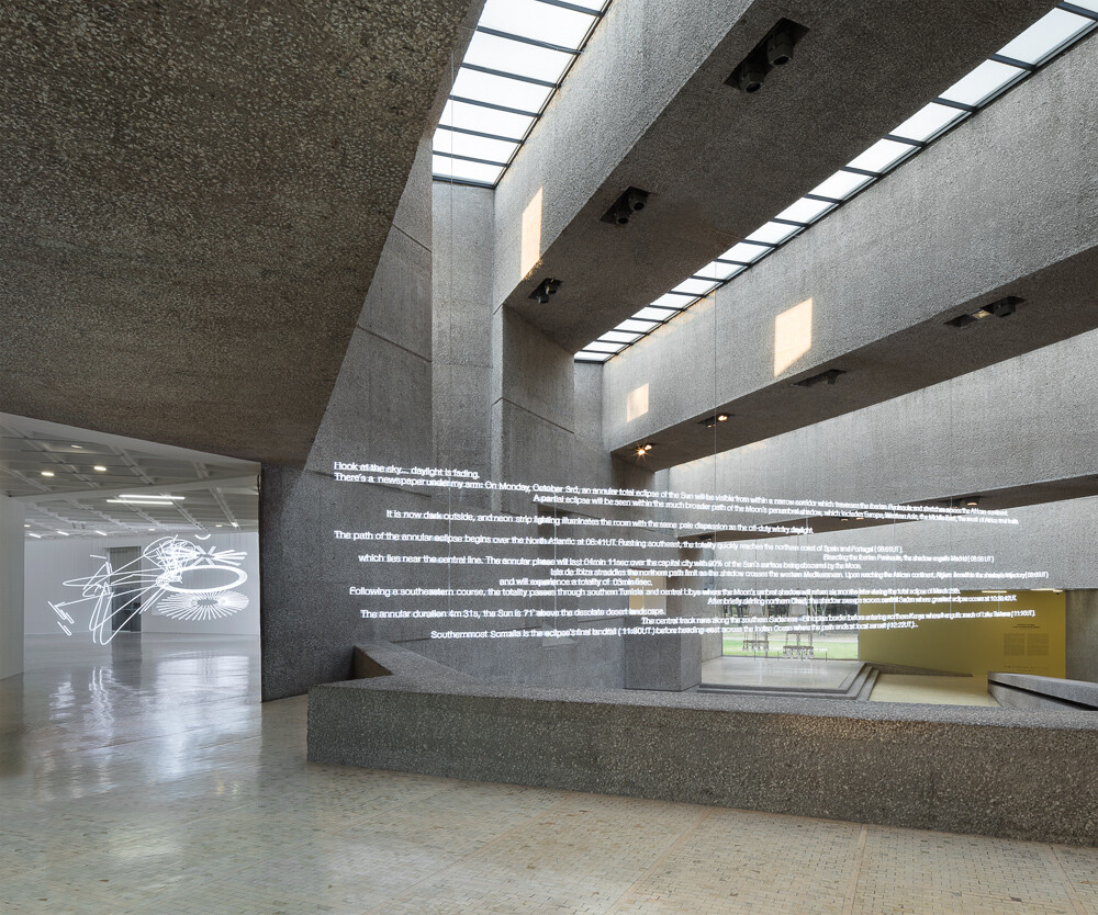 Were I to reproach this exhibition for anything, it would be the very hackneyed art speak used to mediate it. For instance, the claim conveyed in the introductory wall text that Wyn Evans “creates moments of rupture within existing structures of communication” seems a bit fanciful to me. If anything, these so-called ruptures are but a further encoding, even entrenchment, into the highly codified esoterica of contemporary art (nothing signifies “contemporary art” like neon). This is probably best exemplified in E=C=L=I=P=S=E (2015), which hangs in and dominates the atrium of the museum. This massive paragraph-long neon text, which is written in English, describes the progress of a solar eclipse across several continents. All but unreadable, due to the complicated interplay of natural light and neon, the words dissolve into luminescent illegibility. There is a metaphor here. Rather than spell it out, maybe it is enough to say that it has something to do with language, light, adumbration, death, and finally, art.