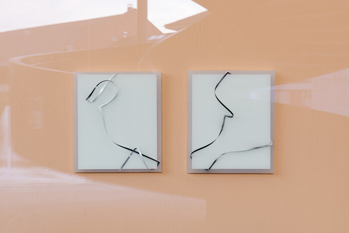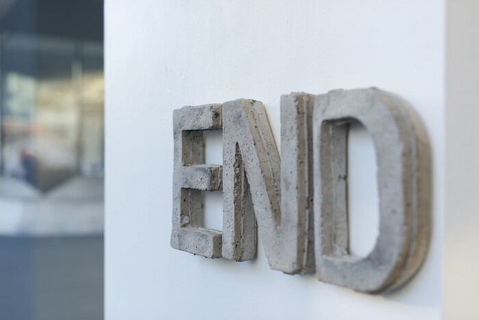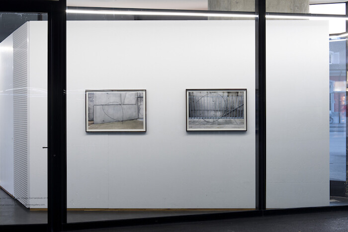 Vitrine Basel thus demands mettle from artists; it is never self-evident that their work should be there, entangled in the mesh of a western city. The site—a good example of the erosion of public space by private interests—is already a microcosm of text, images, and architectures operating on many registers at once, engaging differing degrees of attention, influencing readers more or less directly or obliquely. For the exhibition “Roman-fleuve,” Charlie Godet Thomas makes statements with the economy of corporate identity or signage. Two relief works are single words composed in cast concrete letters, some of which have fallen on the ground and smashed, leaving abbreviated versions behind: OH / MOTHER and FRIEND / END (both 2017). The slightly cartoonish letters are casts of the oasis material into which flowers are stuffed to spell out names in funerary arrangements, adding a mournful and slightly mawkish tinge. The former “OH” reads like a distillate of Philip Larkin’s best-known phrase—“They fuck you up, your mum and dad”2—or a conclusive statement of exasperation. Are they poems, or aphorisms? They function with confident brevity; the space around letters, charged already, resonates still more with what is omitted. Lines Written for and by, No. 3 & 4 (2017) are photographs of black-painted wooden dowels Thomas laced around and through built elements: a wall and a railing. They describe curving arcs, but their crisp, fine lines approach written language; this is form with no meaning ascribed that looks like it is trying to tip into the symbolic. Movable type once took the hand’s written gesture and abstracted it into reusable metal units, then was surpassed by digital printing; Thomas finds play still in the tension between gesture, tool, and mark.