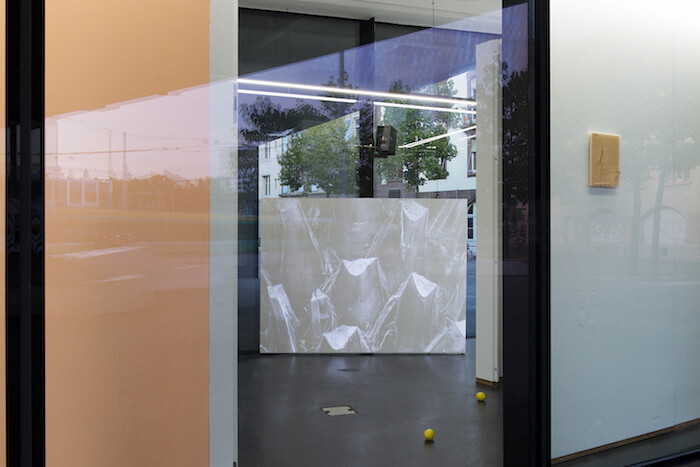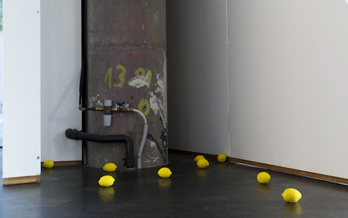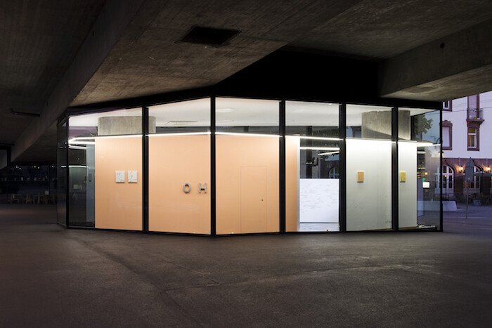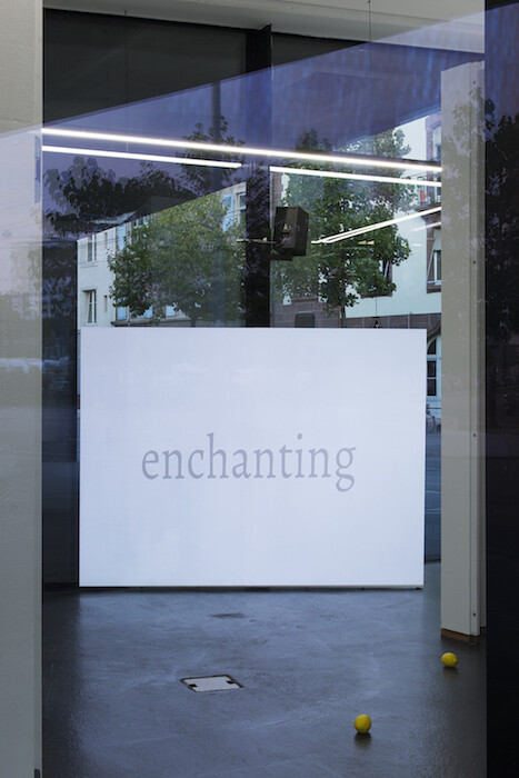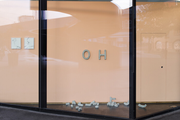Chopped up, the words have been divested of impact. Around the internal floor nine bright yellow, cast rubber lemons lie scattered: Virtues in Disarray (2013-2017). What is real here, what fake? How do we read intention? Thomas’s response to his site, with its reflective surfaces and its numerous demands on our attention, is to offer texts in multiple forms, toying with different methods of communicating, oscillating between registers. A roman-fleuve is an ongoing, ambitious narrative; this exhibition frames a moment in a continuum, and some bright objects crystallize. Short, sweet words and gestures—OH—that can overcome the mass of impressions of an everyday city. Thus employed, Vitrine Basel does not define the city’s powers but enables countermovement.