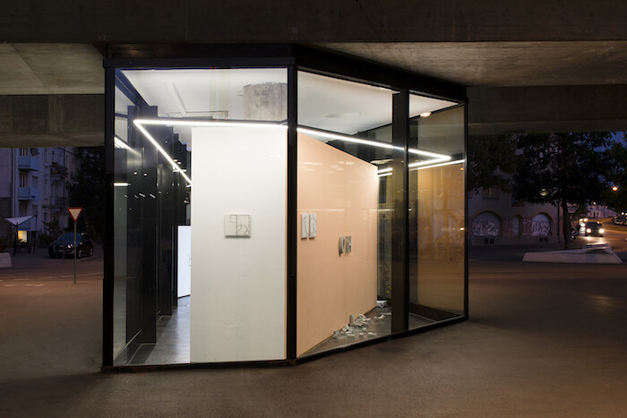 An exhibition vitrine in a contemporary exhibition is a knowing nod to long traditions of display. By recreating a form of museum presentation, it relates to what Tony Bennett calls the “museum idea”1 and its way of defining knowledge and, more broadly, power. Museums, according to Bennett, are places where visitors are taught their place in a society. But Vitrine gallery’s two locations, while behind glass, are antitheses of such authoritative presentation. Founder and director Alys Williams’s model is to create shows displayed in large shop window spaces, visible 24 hours a day. Her London gallery, in Bermondsey Square, is relatively simple; the Basel site, in comparison, has an irregular pentagon footprint with walls placed within, its minute office at the center. Though behind glass, exhibitions are effectively on the outside, not a protected interior. The gallery hunkers under a road bridge, surrounded by a fast food kiosk, a spiral staircase, a supermarket, and a tram stop. Artists have to compete visually and aurally with their surroundings and the everyday life that plays out in a space far from most hermetic art contexts.