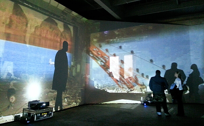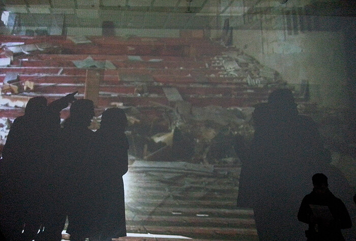 Thater’s 2011 video installation, filling the exhibition space with moving images of the abandoned buildings and forestation of the 30-kilometer-wide “zone of alienation” that surrounds the site of the 1986 Chernobyl nuclear disaster, poignantly illustrates nature’s fraught coexistence with the most advanced landmarks of civilization. The spectacle of an analogous catastrophe, both more extreme and more manifestly human-caused than the recent superstorm, offered a classically cathartic experience for an overwhelmed crowd consisting largely of artists and gallery workers. With six projectors beaming a haunted landscape onto the hexagonal walls erected for this show—catching the silhouettes of spectators along the light’s path—a region rendered uninhabitable by radioactivity came much closer to home. Particularly uncanny was the resemblance of Chelsea’s ground-level galleries after the floods to the image of a music classroom in Chernobyl cluttered by waste. But perhaps it was the sense of stillness that most vividly connected the two distant sites and situations.