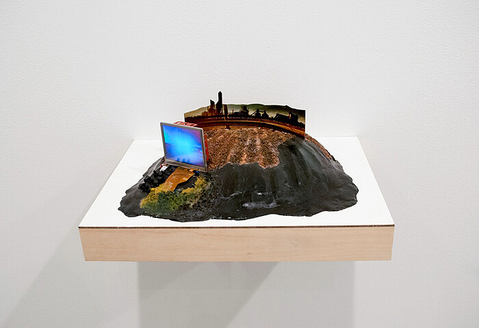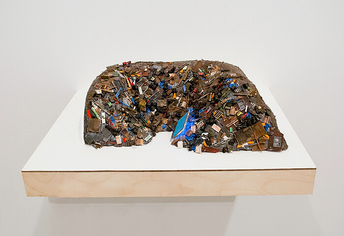 Up the street from David Zwirner, east of The Kitchen’s tragically battered performance space, Postmasters is exhibiting work by the new-media artist couple Jennifer and Kevin McCoy. On view since before the storm hit, it is similarly pertinent to both the confluence of natural and man-made destruction and societal constructions of time. Titling their show “Twenty One Twelve,” the McCoys not only document the present’s obsession with an ancient prophecy denoting 2012 as the year of the apocalypse, but also look a century forward, beyond the alleged “end times.” They capitalize on this Hollywood-ready framework to fabricate alternative scenarios to the dystopian environments offered by blockbusters set in an anxiety-laden future. In several miniature, diorama-like sculptures, the artists place mini-LCD screens amongst heaps of waste, allowing impressive-looking communication towers and luxurious resorts to coexist with dumps.