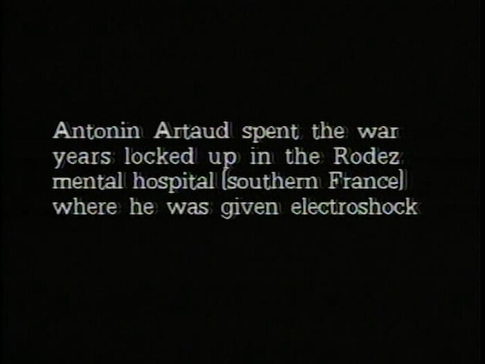 I hear your voice throughout these films. Formally, they range from documentary—such as Voyage to Rodez (1986), in which you recount an episode in Antonin Artaud’s life, and Traveling at Night (1990), about a field trip to a deconsecrated Wesleyan Methodist Church in Darrowsville, New York—to fiction. Sadness at Leaving (1992), for example, is based on Erje Ayden’s 1987 autobiographical novel of the same name, about his time as a Turkish spy. But it’s the Super 8 film In Order to Pass (1982) that helps me understand your motivation. In one of the intertitles, which interrupts footage of a group of artists in the woods, you write: “The fantasizer locates the ideal state but then uses the imagination to create a progression into the present and future.” You suspend everything in a constant state of transition. The harrowing consequence is that what comes next is neither gentle nor satisfying. Reality, in your work, is an endless battleground.